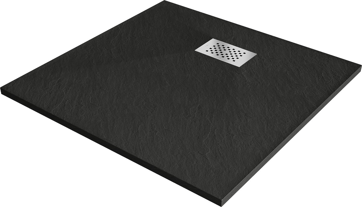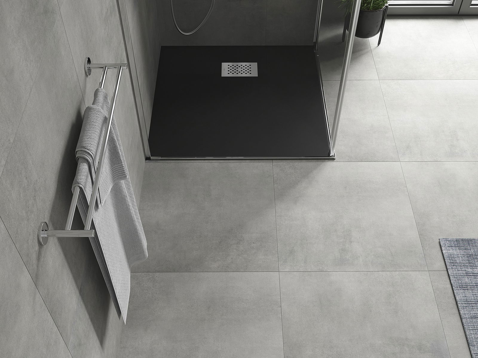 La surface du receveur de douche évoque la pierre. C'est une combinaison unique d'aspect naturel et de design intérieur moderne. Il ajoute du caractère, souligne l'esthétique et l'élégance de la salle de bains et séduit par sa forme.
