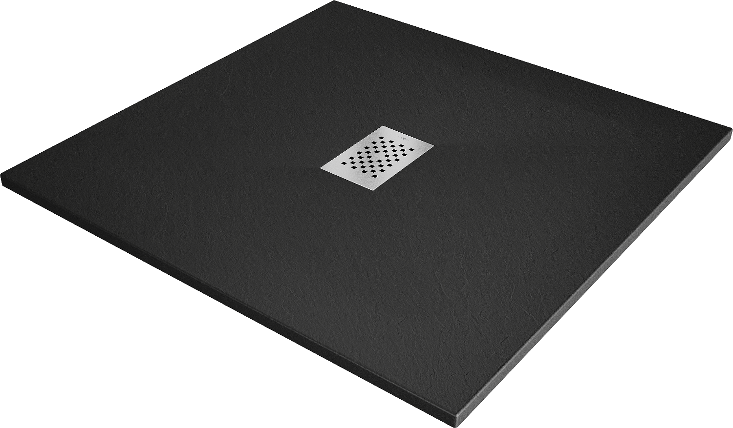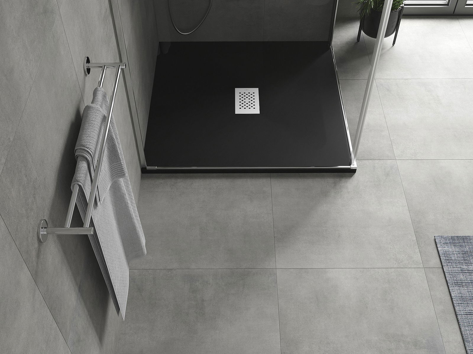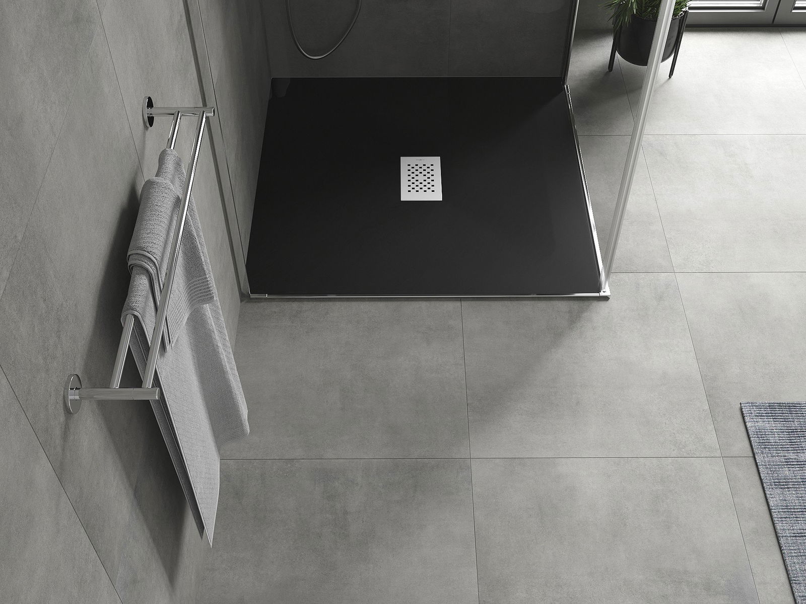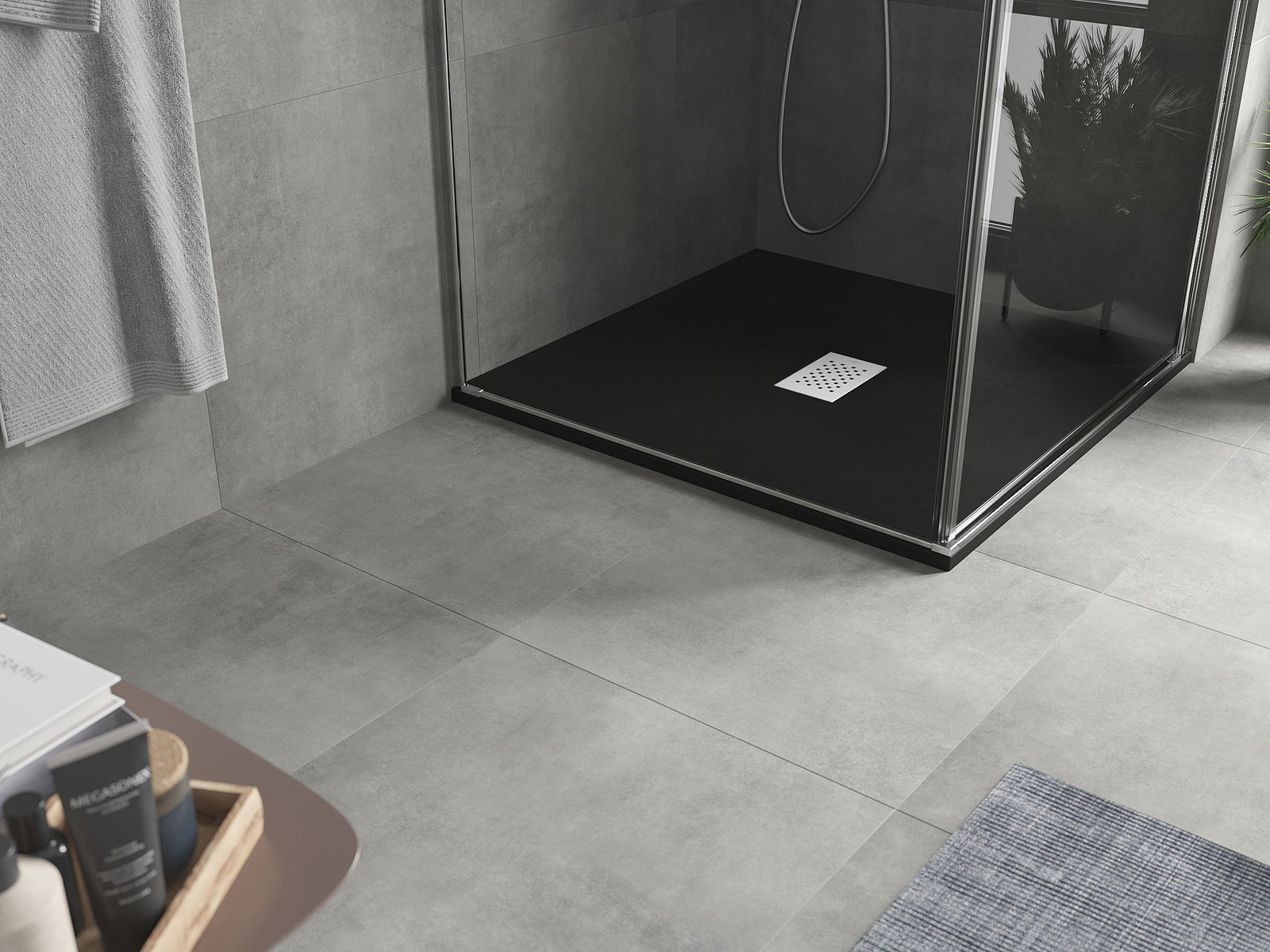 La surface du receveur de douche évoque la pierre. C'est une combinaison unique d'aspect naturel et de design intérieur moderne. Il ajoute du caractère, souligne l'esthétique et l'élégance de la salle de bains et séduit par sa forme.