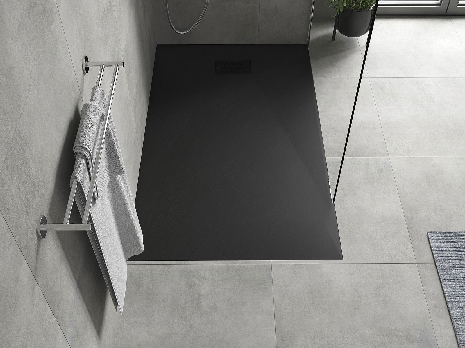 La surface du receveur de douche rappelle par sa structure la pierre. Elle constitue une combinaison exceptionnelle d'un aspect naturel et d'un aménagement intérieur moderne. Elle ajoute du caractère, souligne l'esthétique et l'élégance de la décoration de la salle de bains et séduit par sa forme.