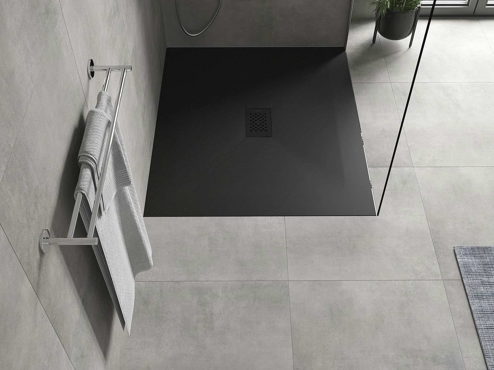 La surface du receveur de douche évoque la pierre. C'est une combinaison unique d'aspect naturel et de design intérieur moderne. Il ajoute du caractère, souligne l'esthétique et l'élégance de la salle de bains et séduit par sa forme.