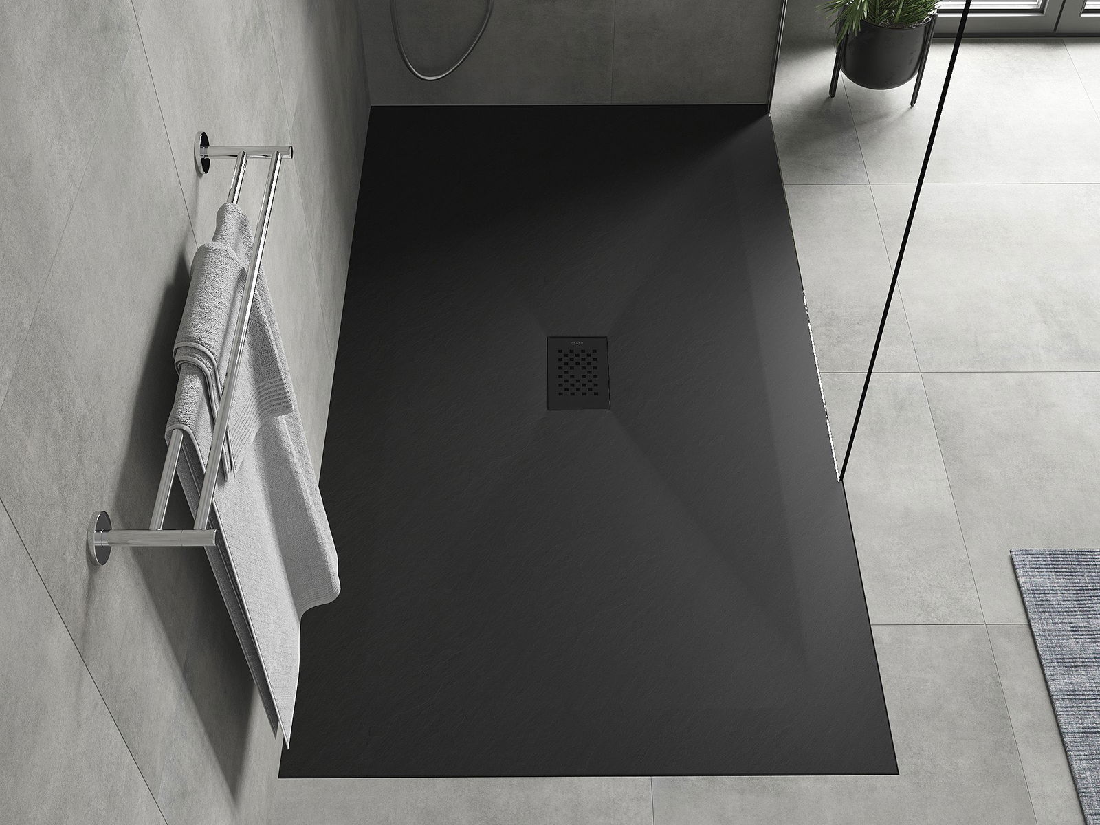 La surface du receveur de douche évoque la pierre. C'est une combinaison unique d'aspect naturel et de design intérieur moderne. Il ajoute du caractère, souligne l'esthétique et l'élégance de la salle de bains et séduit par sa forme.