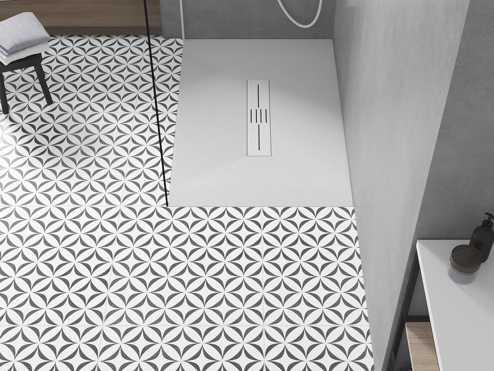 La surface du receveur de douche évoque la pierre. C'est une combinaison unique d'aspect naturel et de design intérieur moderne. Il ajoute du caractère, souligne l'esthétique et l'élégance de la salle de bains et séduit par sa forme.