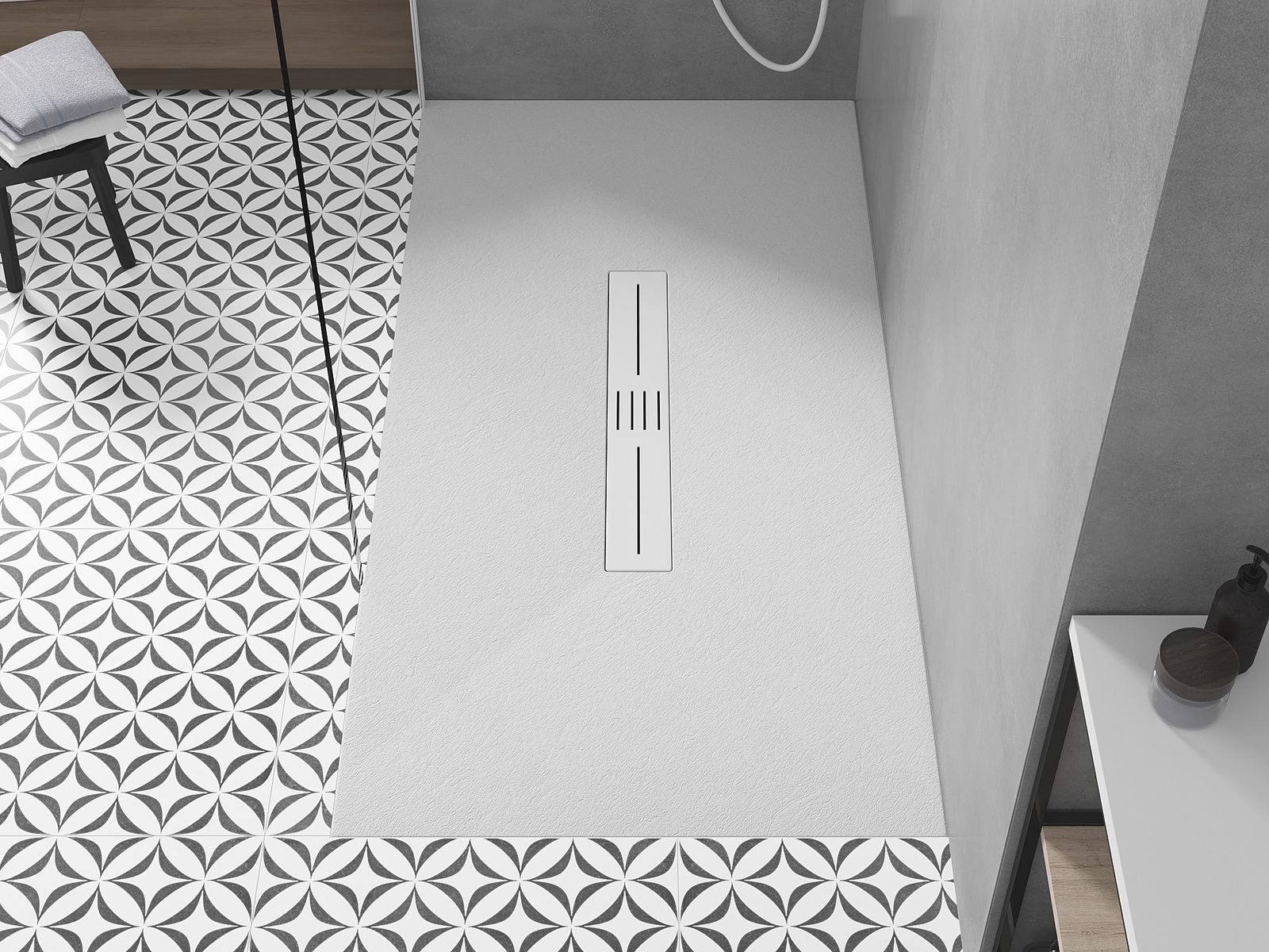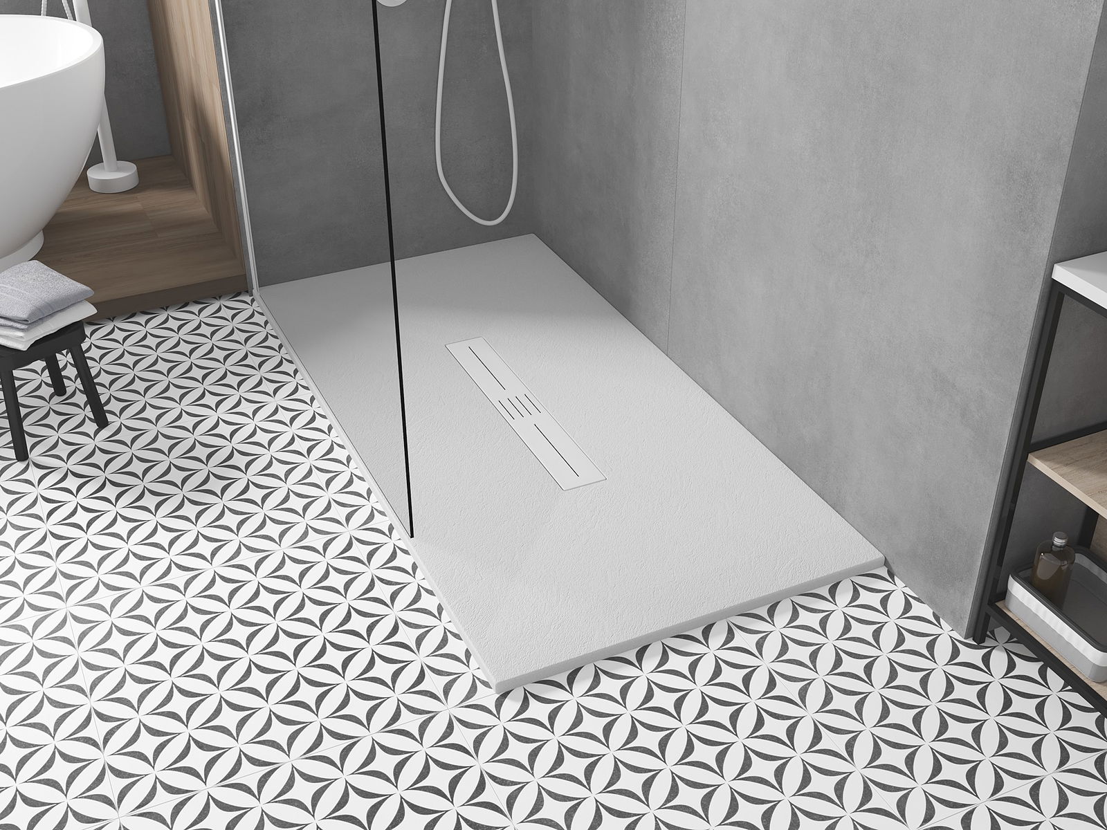 La surface du receveur de douche rappelle par sa structure la pierre. Elle constitue une combinaison exceptionnelle d'un aspect naturel et d'un aménagement intérieur moderne. Elle ajoute du caractère, souligne l'esthétique et l'élégance de la décoration de la salle de bains et séduit par sa forme.