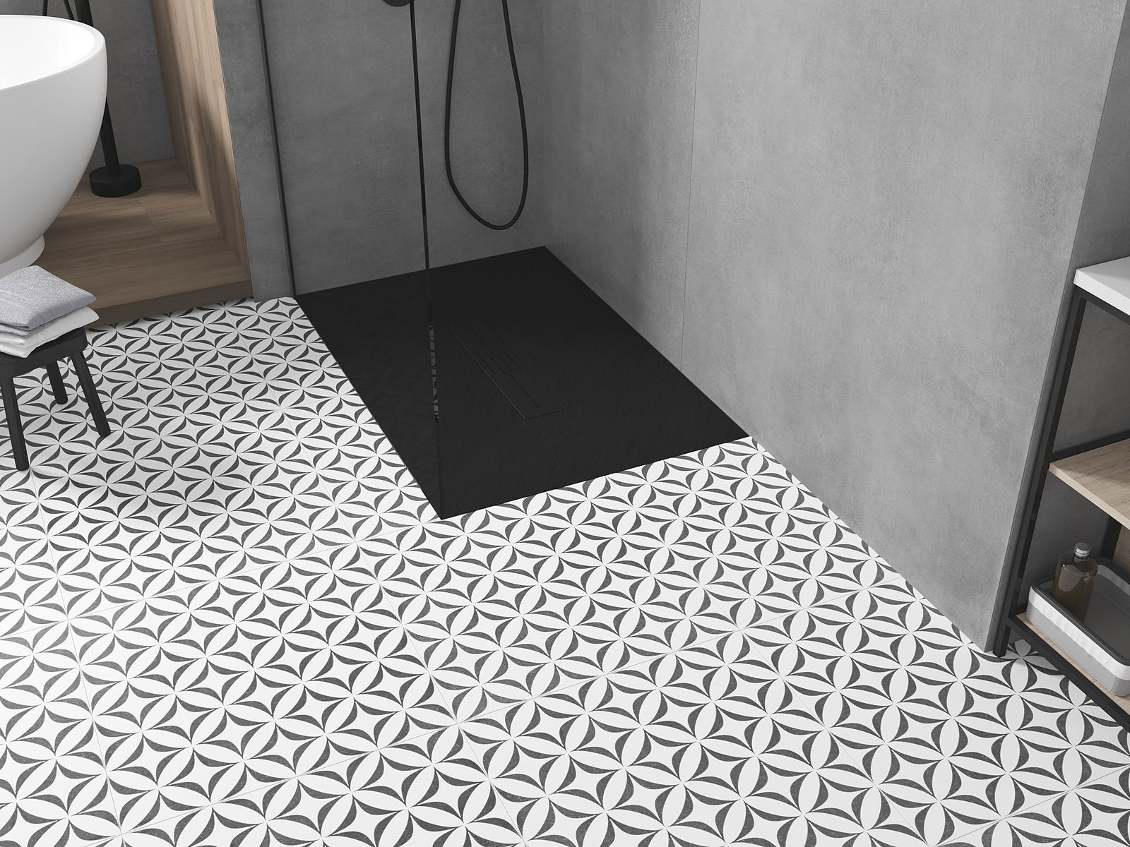La surface du receveur de douche évoque la pierre. C'est une combinaison unique d'aspect naturel et de design intérieur moderne. Il ajoute du caractère, souligne l'esthétique et l'élégance de la salle de bains et séduit par sa forme.