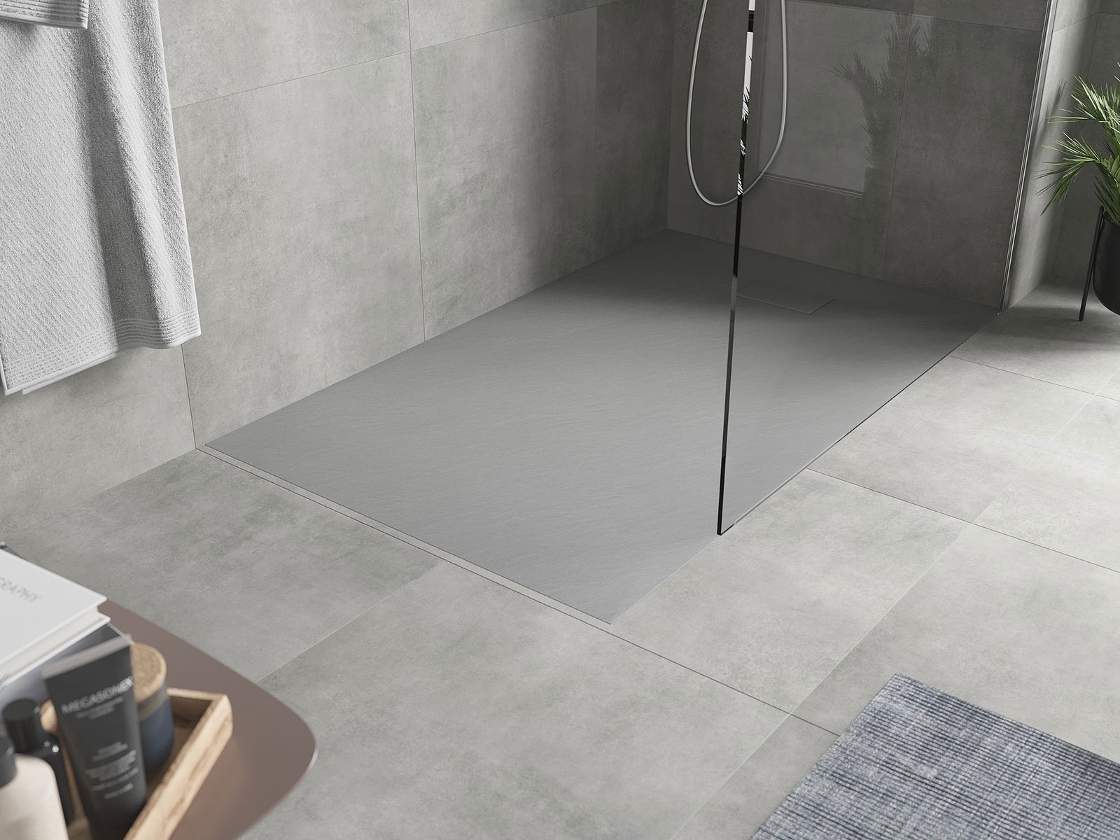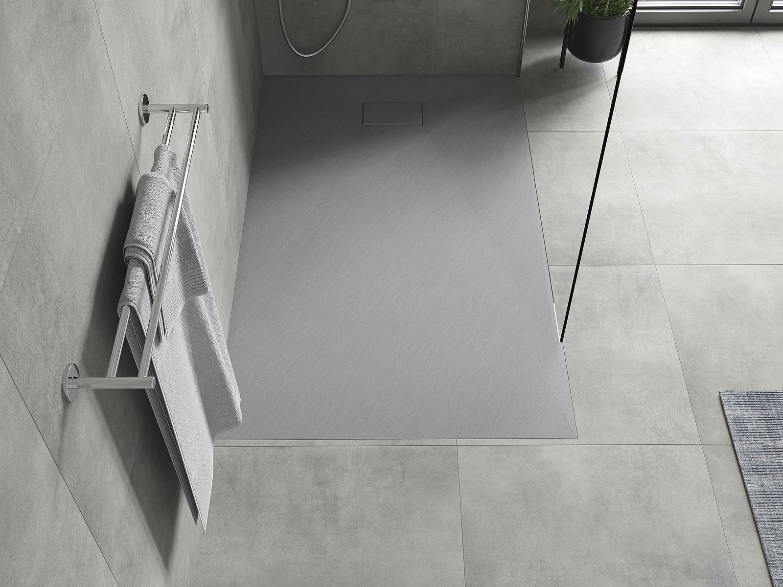 La surface du receveur de douche rappelle par sa structure la pierre. Elle constitue une combinaison exceptionnelle d'un aspect naturel et d'un aménagement intérieur moderne. Elle ajoute du caractère, souligne l'esthétique et l'élégance de la décoration de la salle de bains et séduit par sa forme.