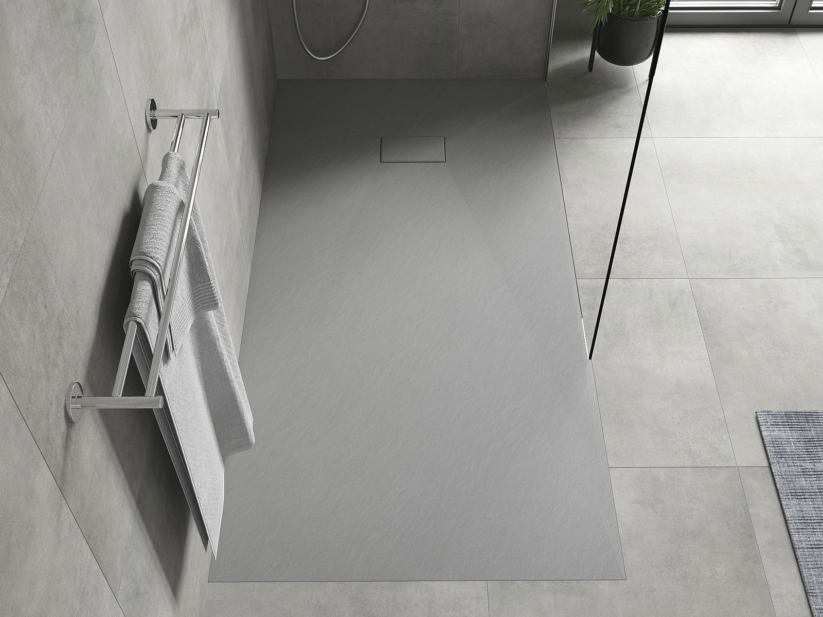 La surface du receveur de douche évoque la pierre. C'est une combinaison unique d'aspect naturel et de design intérieur moderne. Il ajoute du caractère, souligne l'esthétique et l'élégance de la salle de bains et séduit par sa forme.