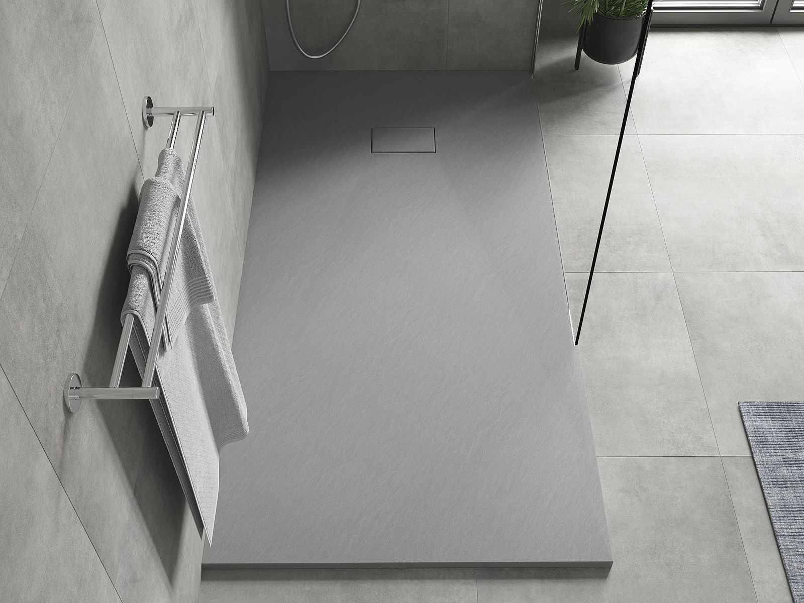 La surface du receveur de douche évoque la pierre. C'est une combinaison unique d'aspect naturel et de design intérieur moderne. Il ajoute du caractère, souligne l'esthétique et l'élégance de la salle de bains et séduit par sa forme.