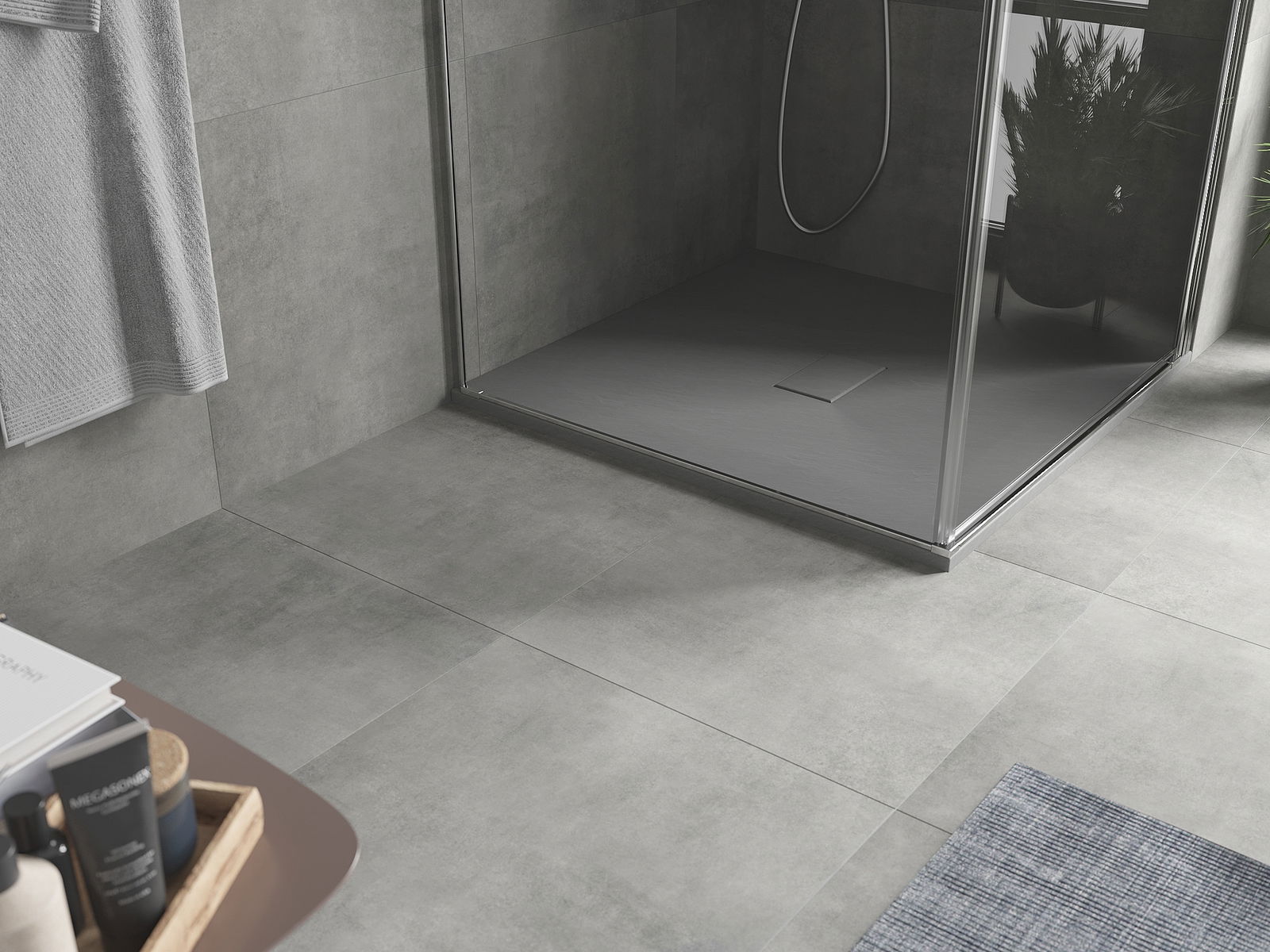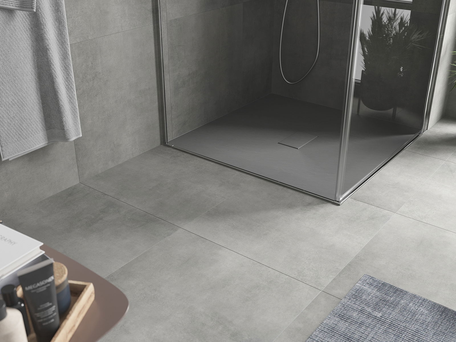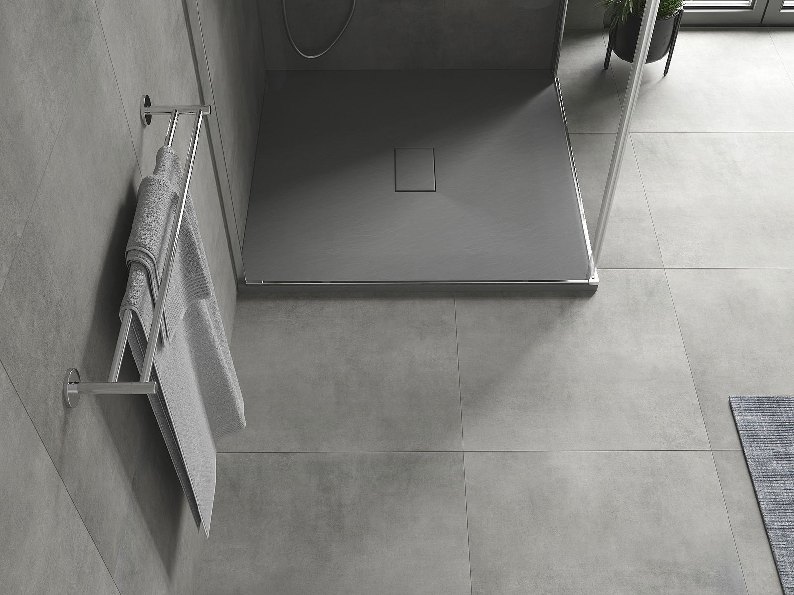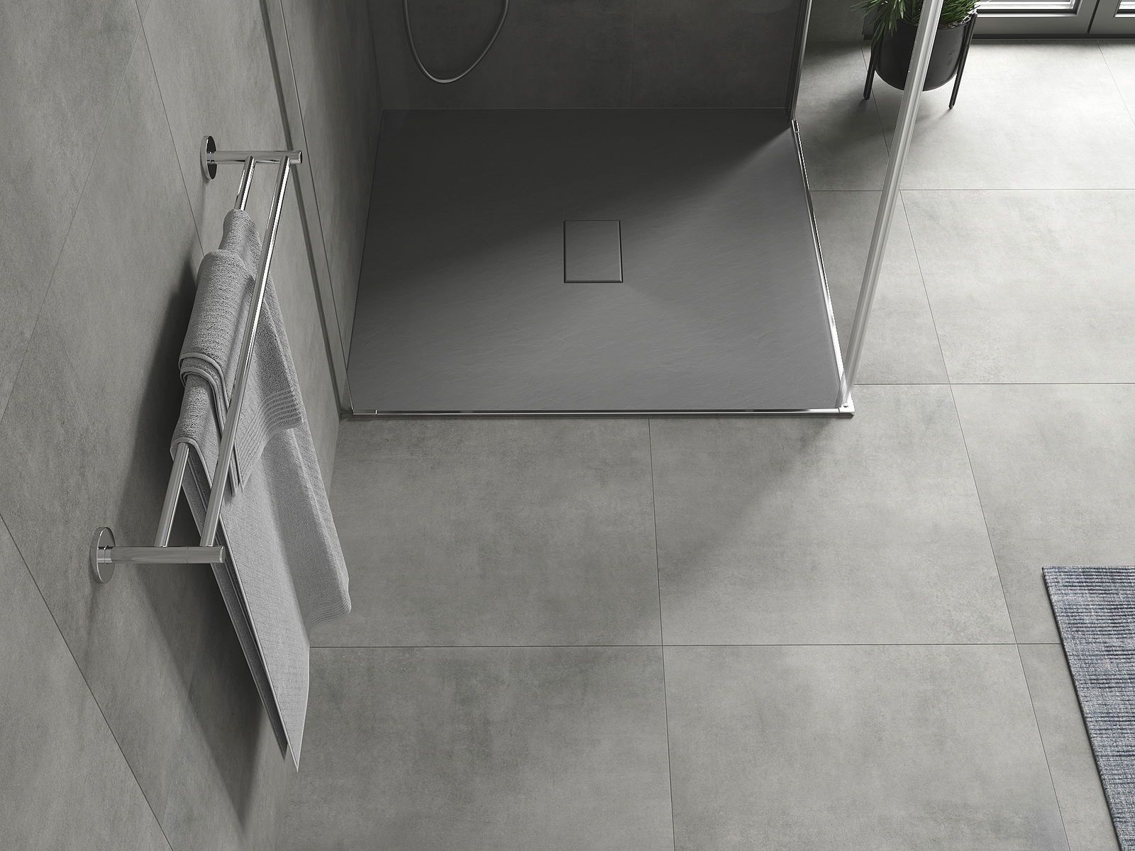 La surface du receveur de douche évoque la pierre. C'est une combinaison unique d'aspect naturel et de design intérieur moderne. Il ajoute du caractère, souligne l'esthétique et l'élégance de la salle de bains et séduit par sa forme.