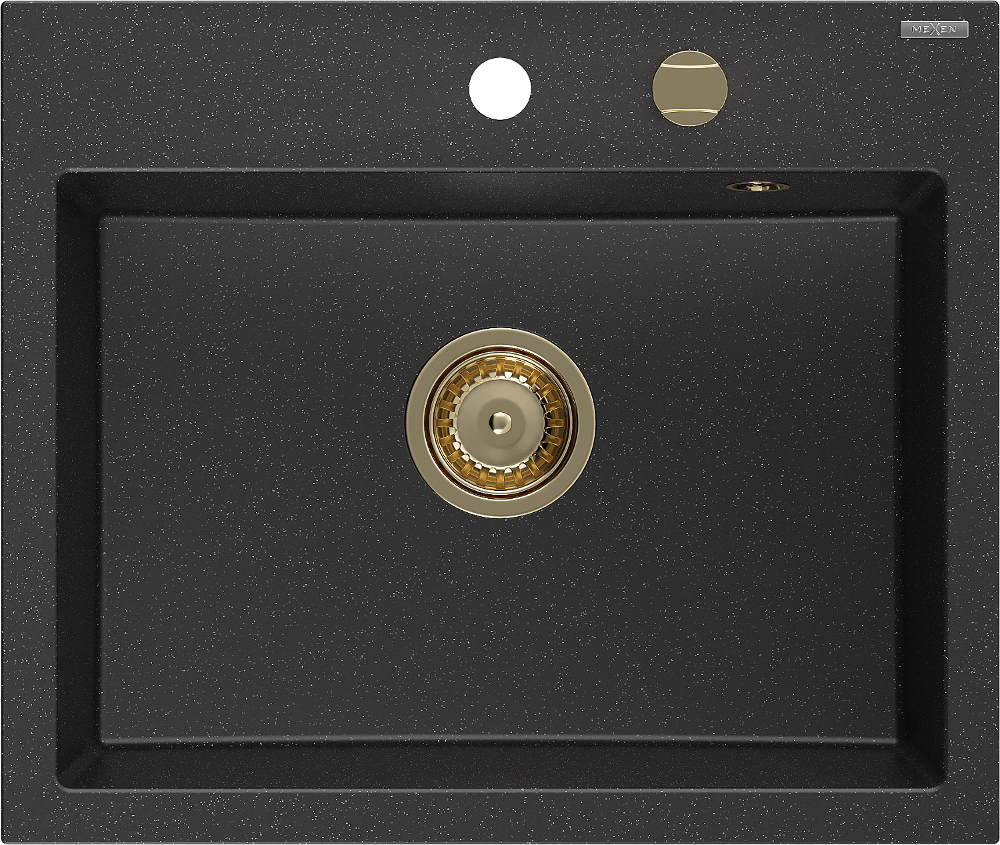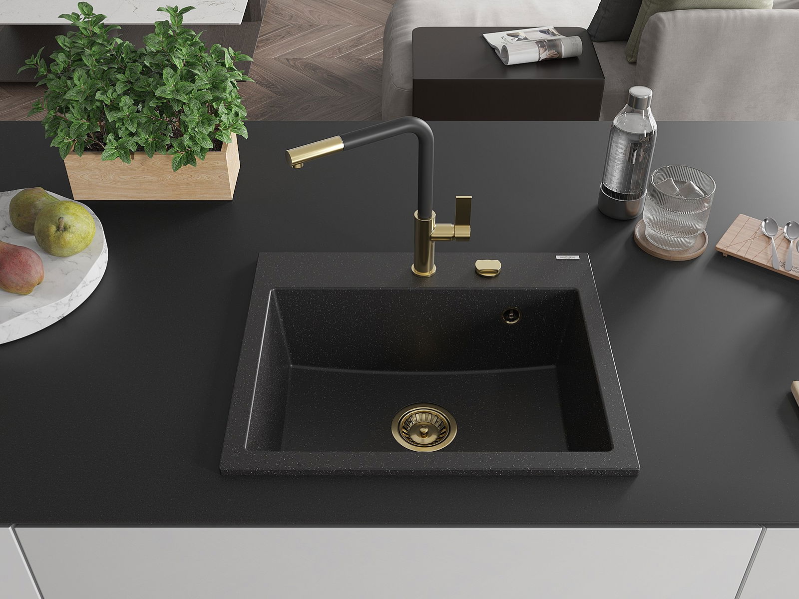 Mexen Oscar évier en granit 1-bac 580 x 490 mm, noir/argent métallisé, siphon en or - 6519581000-73-G