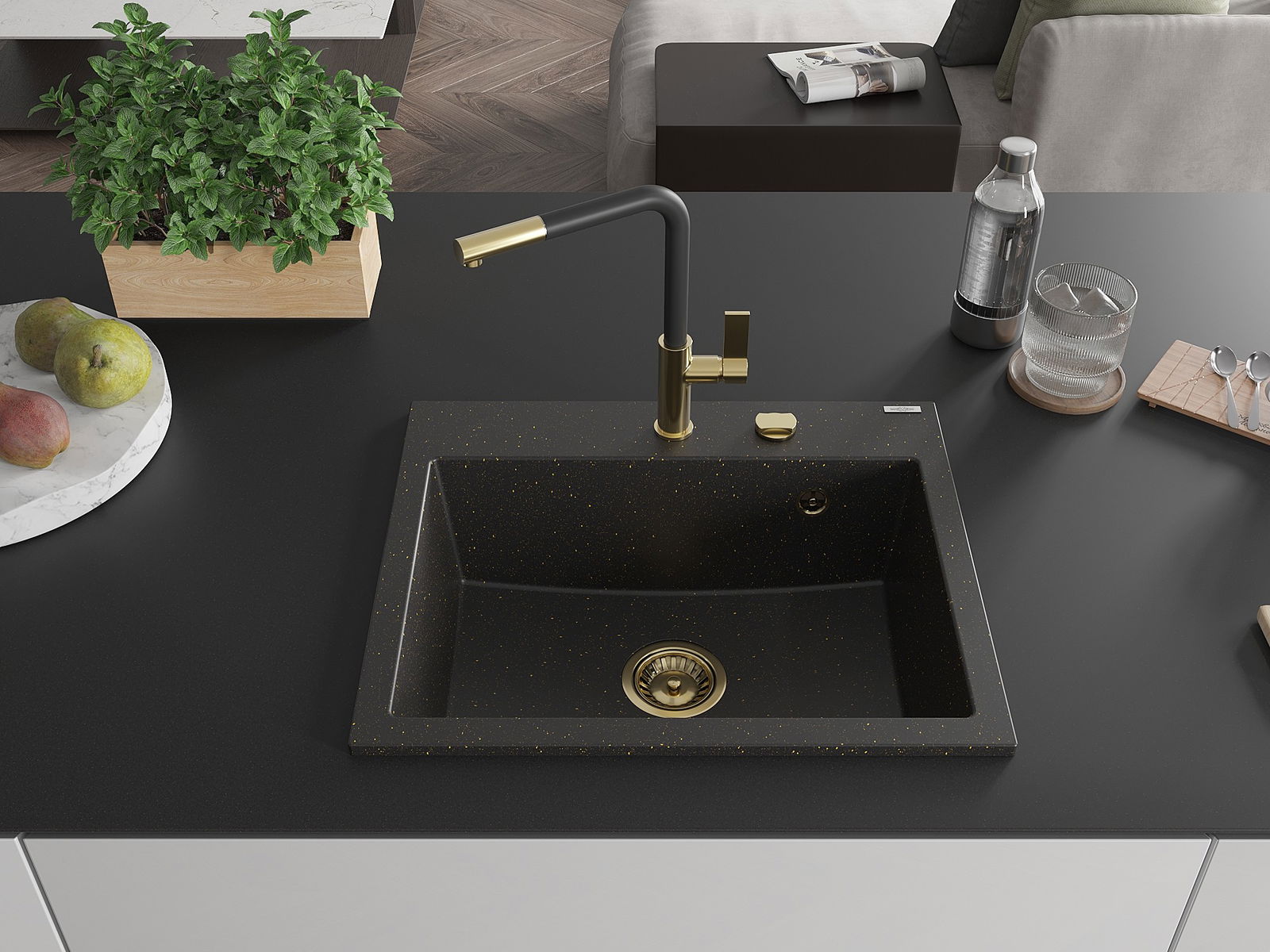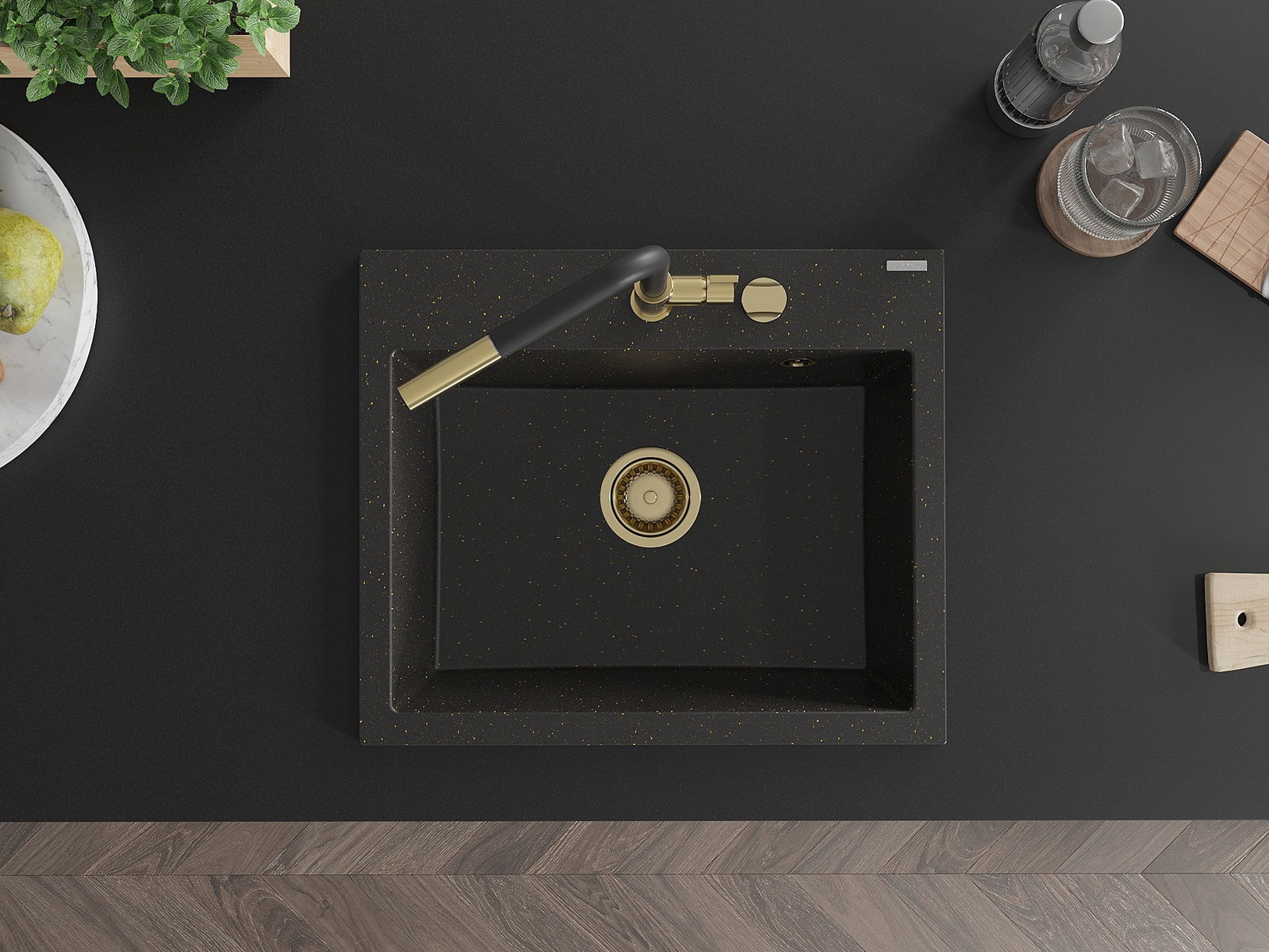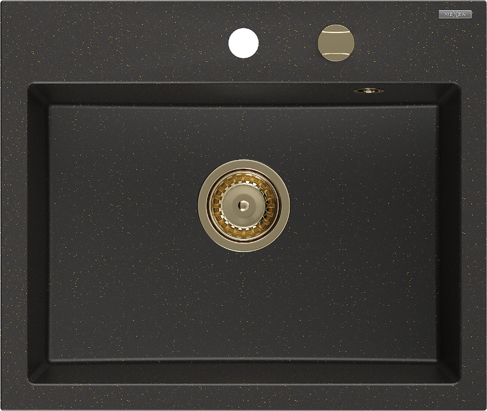 Mexen Oscar évier en granit 1 bac 580 x 490 mm, noir/doré métallique, siphon doré - 6519581000-75-G