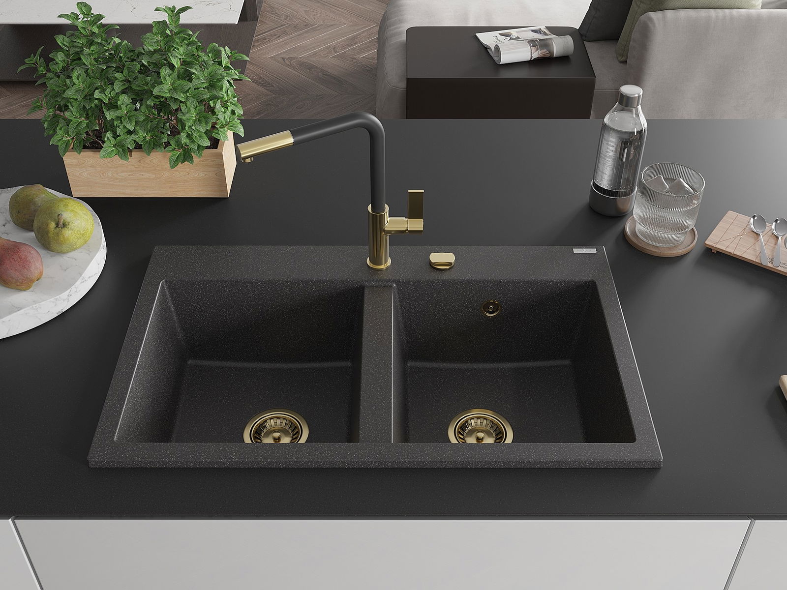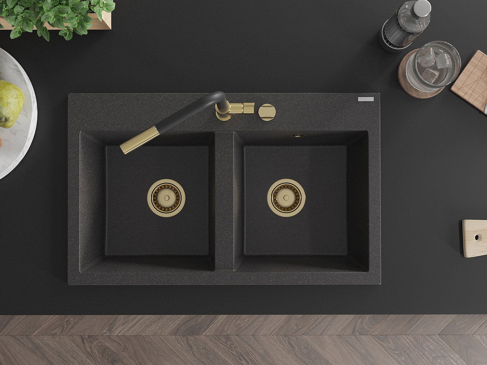 Mexen Hektor évier en granit 2 cuves 800 x 480 mm, noir moucheté, siphon doré - 6521802000-76-G