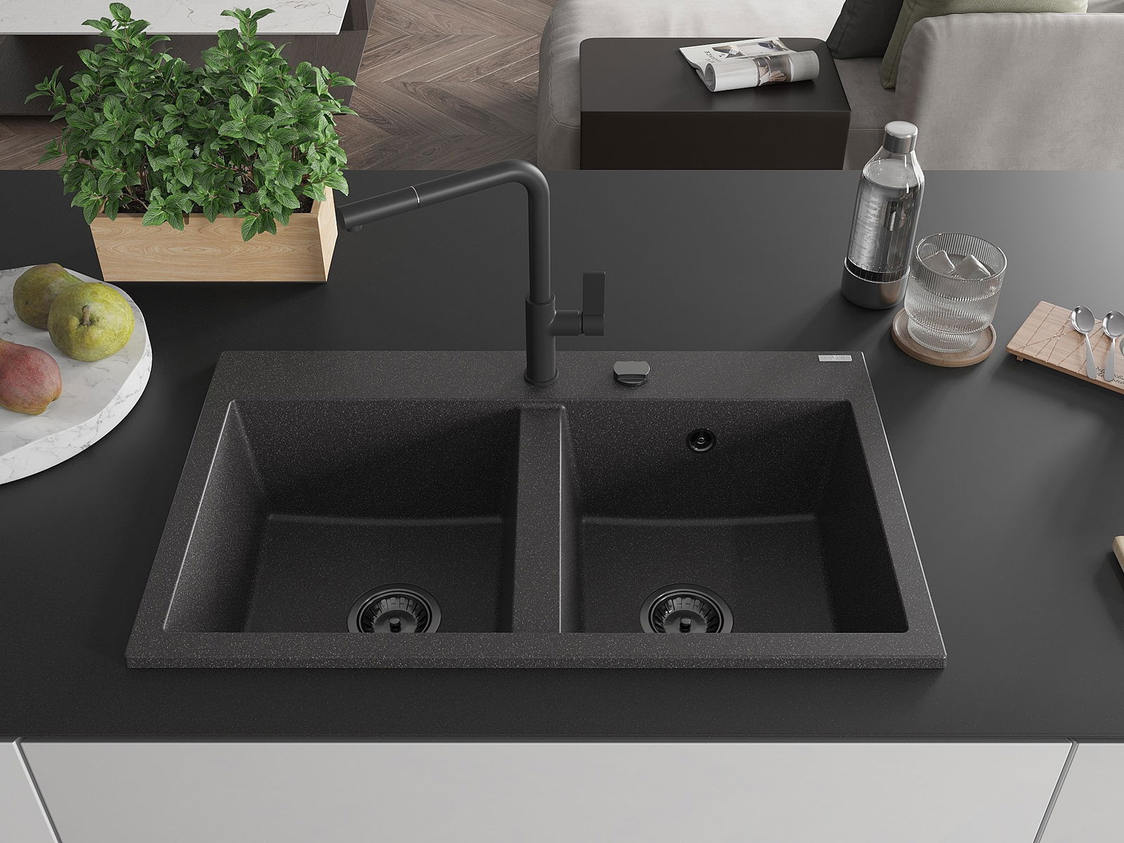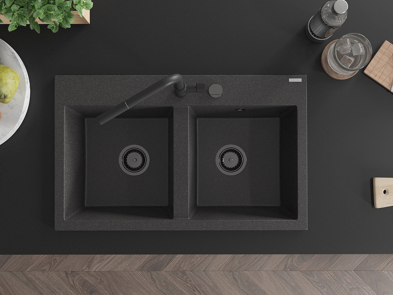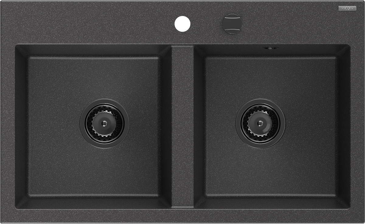 Mexen Hektor évier en granit à 2 bacs 800 x 480 mm, noir moucheté, siphon noir - 6521802000-76-B