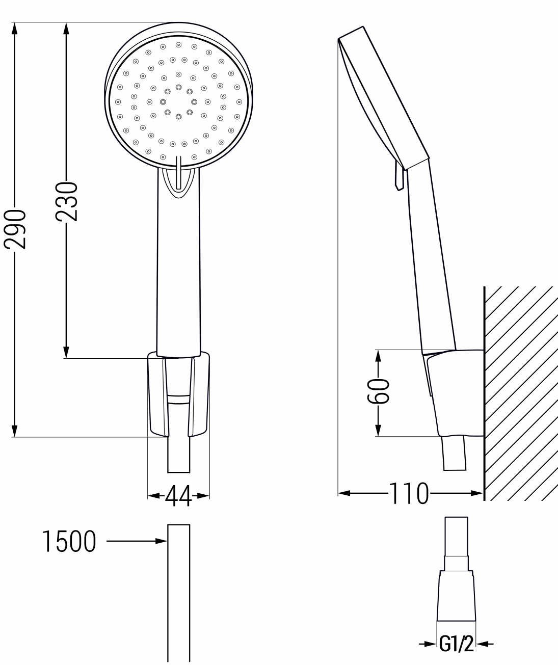 Le pommeau de douche est doté d'un jet pluie. Ce jet imite la pluie naturelle et s'écoule uniformément sur le corps. Il procure une sensation douce et relaxante pendant le bain, qui devient un véritable moment de détente.