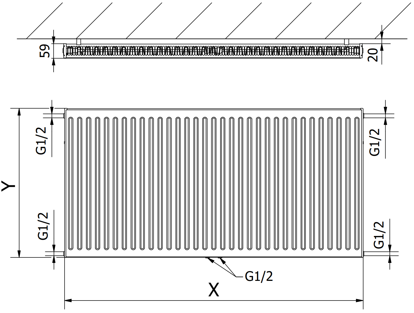 Les images montrent le radiateur en taille 600 x 1200 mm.