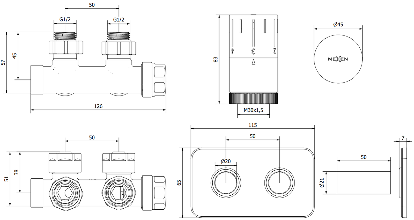 Entraxe des ouvertures pour les raccordements de radiateur: 50 mm