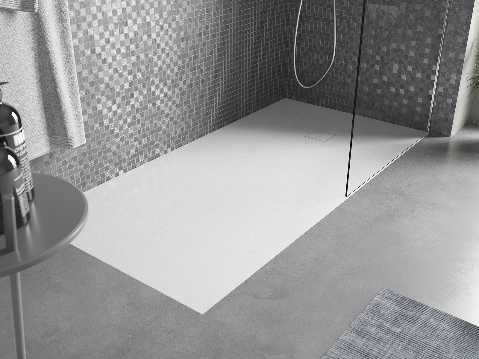 La surface du receveur de douche rappelle par sa structure la pierre. Elle constitue une combinaison exceptionnelle d'un aspect naturel et d'un aménagement intérieur moderne. Elle ajoute du caractère, souligne l'esthétique et l'élégance de la décoration de la salle de bains et séduit par sa forme.