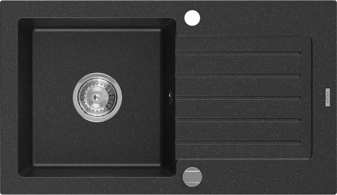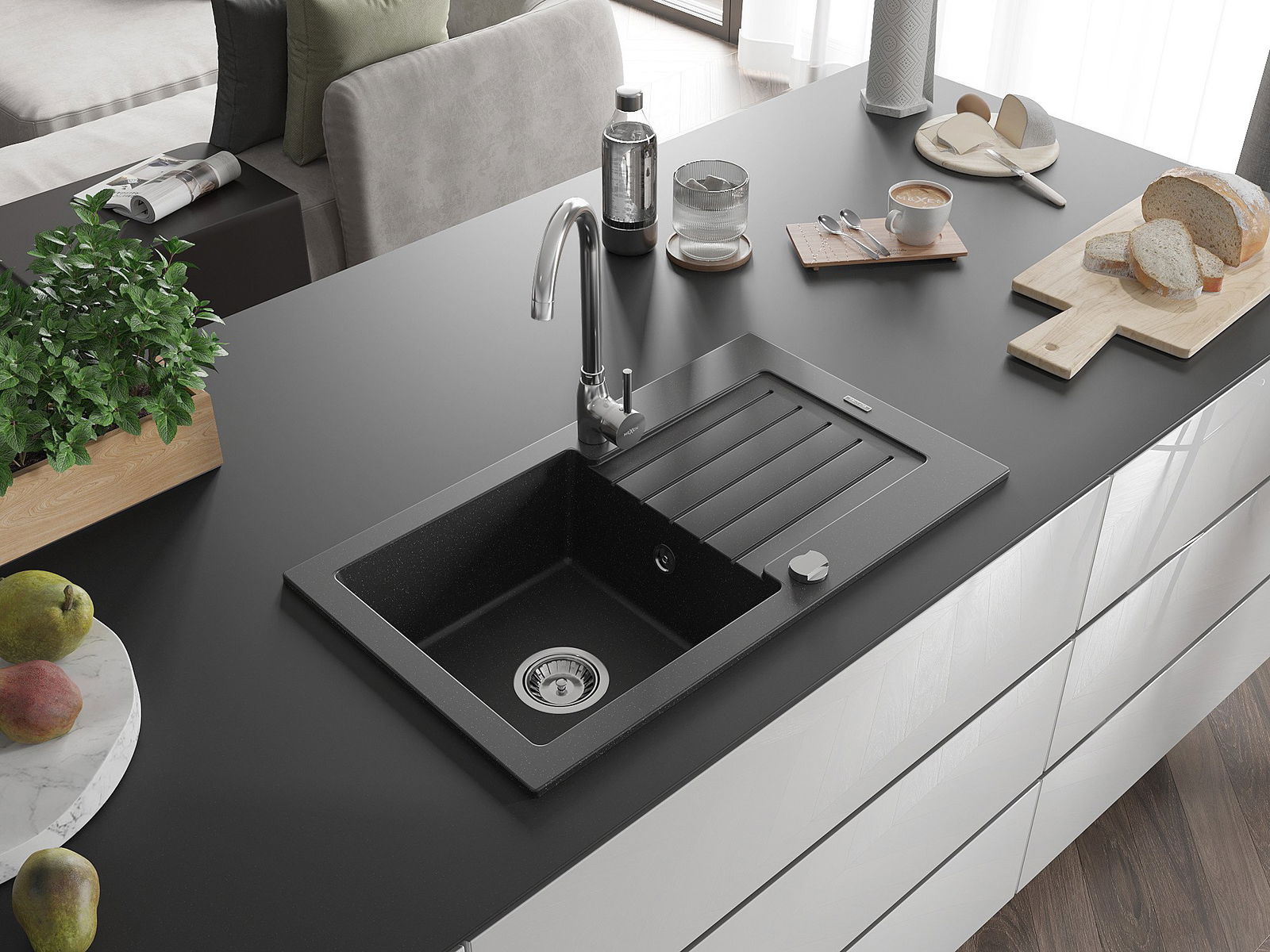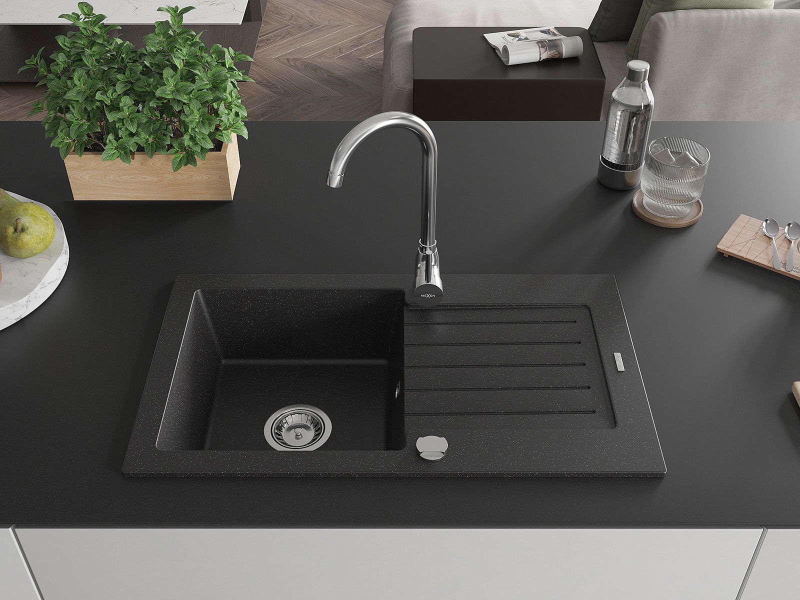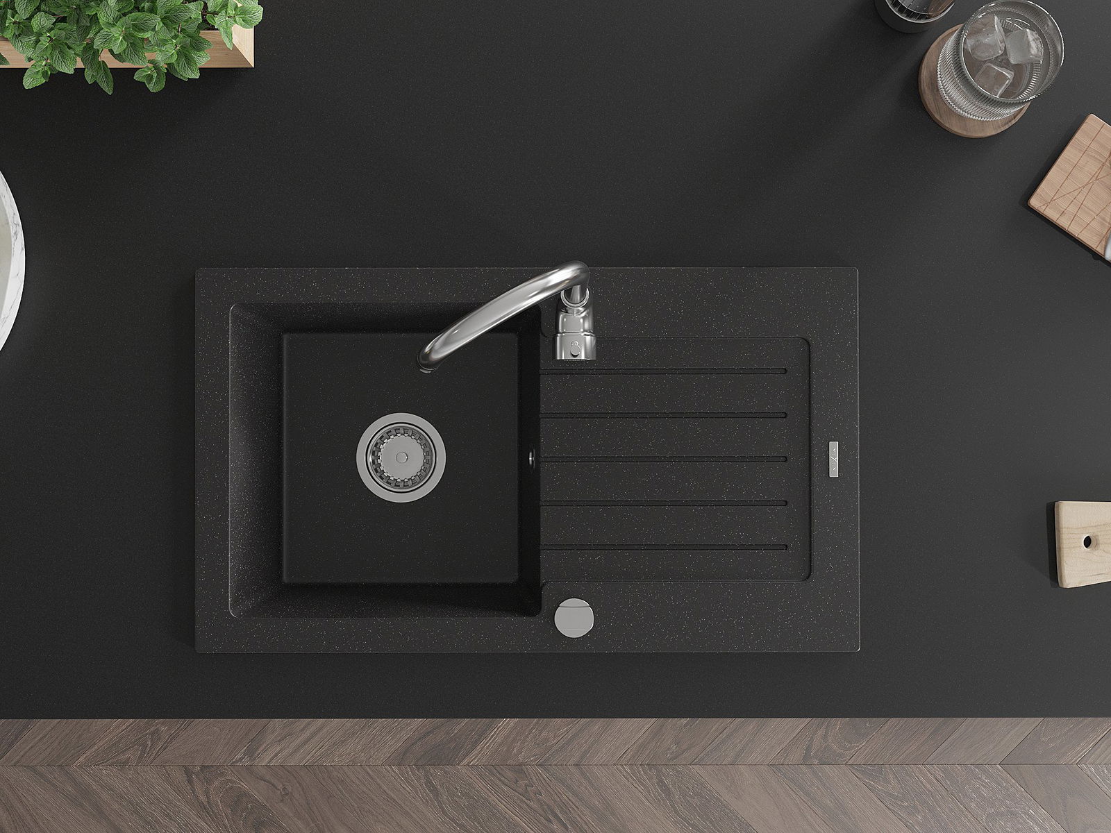 Mexen Pablo évier en granit 1 bac avec égouttoir 752 x 436 mm, noir/métallisé argent, siphon chromé - 6510751010-73