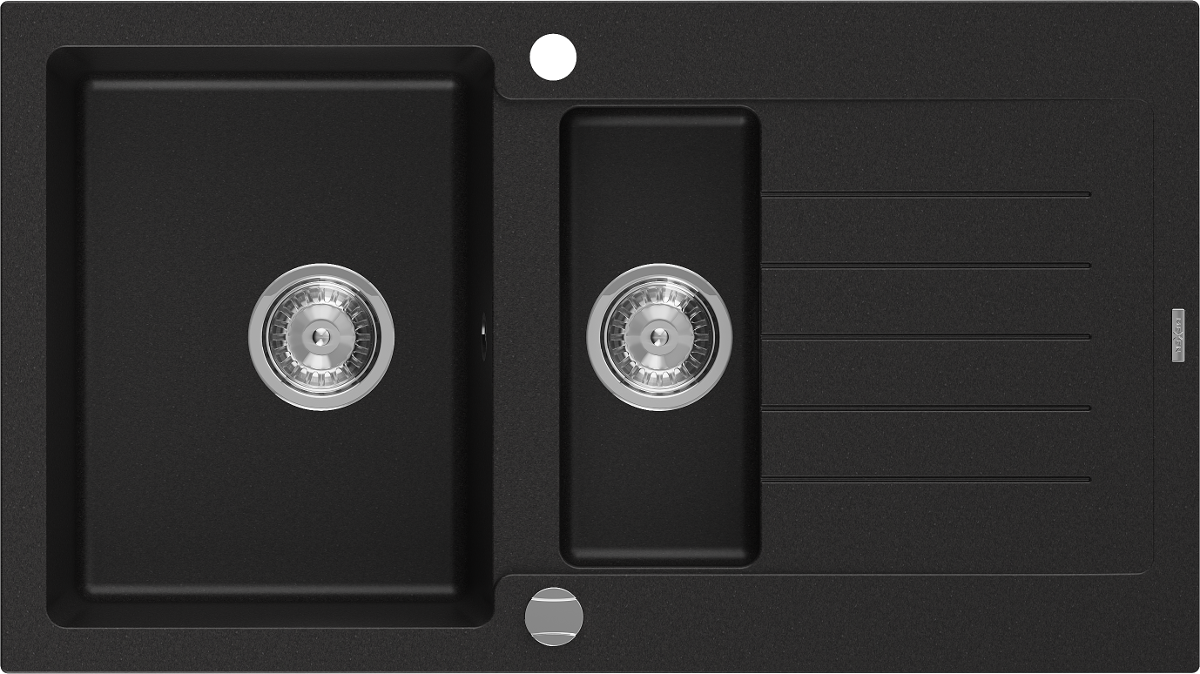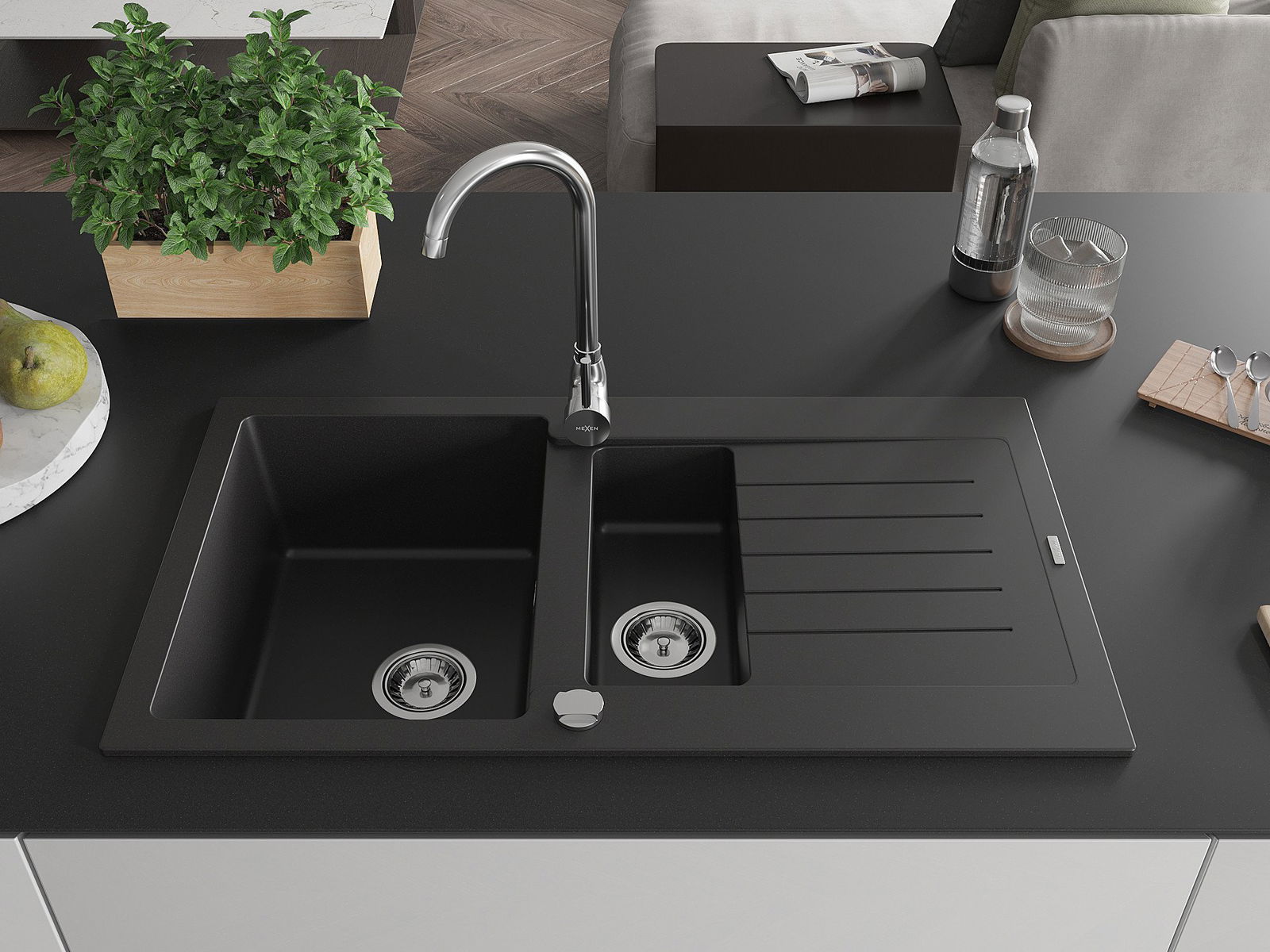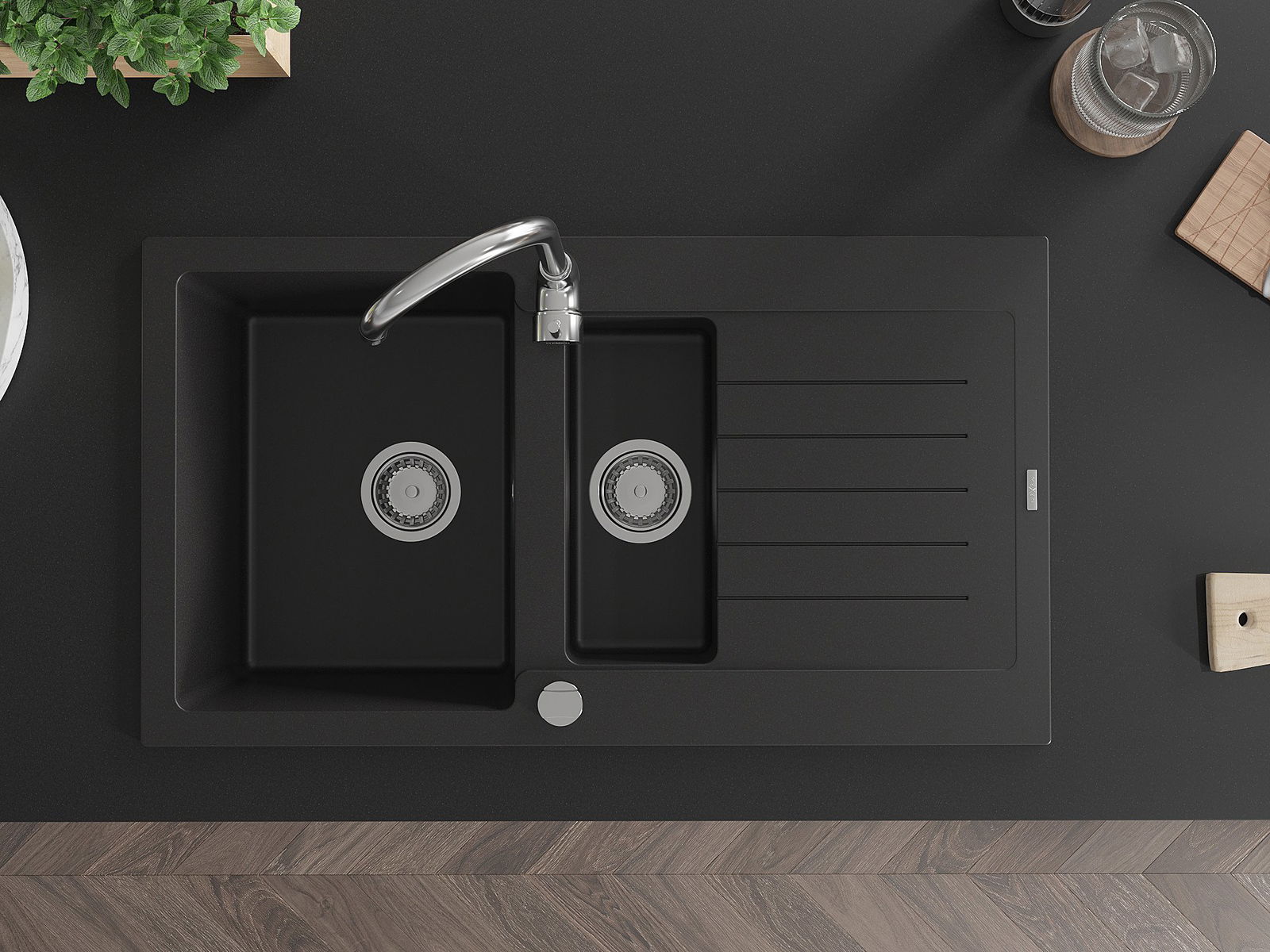 Mexen Matias évier en granit 1,5 bac avec égouttoir 900 x 505 mm, noir, siphon chromé - 6502901505-77