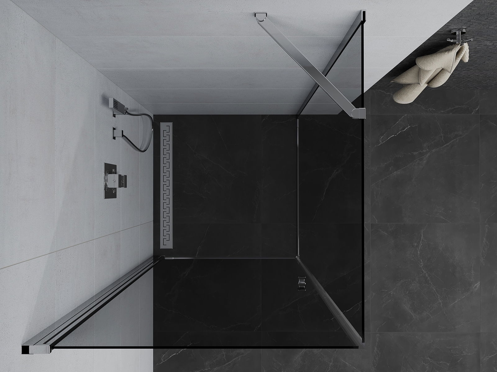 La poignée pratique et confortable est fabriquée en métal durable et résistant. Sa forme élégante, associée à une finition assortie à la couleur des profilés, confère à l'ensemble un style moderne et élégant, soulignant l'esthétique de chaque salle de bains.