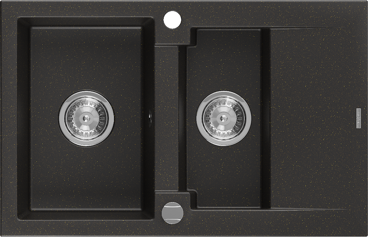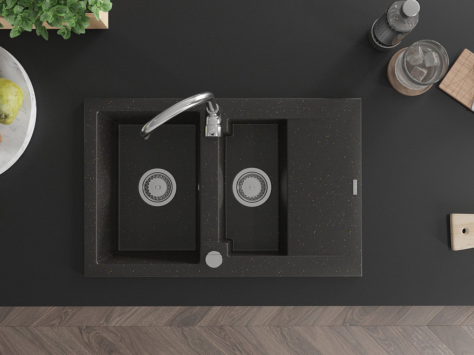 Mexen Gaspar évier en granit 1,5 bac avec égouttoir 737 x 475 mm, noir/métallisé doré, siphon chromé - 6507731505-75