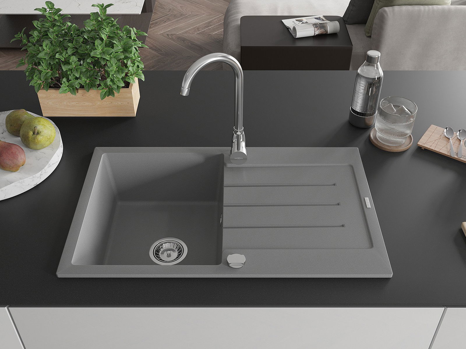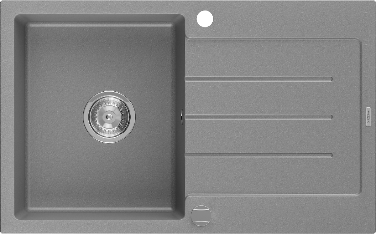 Mexen Bruno évier en granit 1 bac avec égouttoir 795 x 495 mm, gris, siphon chrome - 6513791010-71