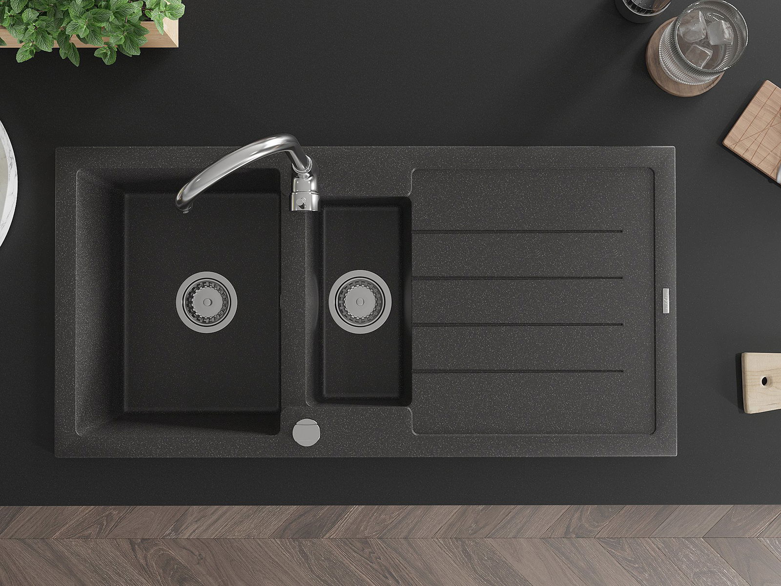Mexen Andres évier en granit 1,5 bac avec égouttoir 1000 x 500 mm, noir moucheté, siphon chromé - 6515101510-76