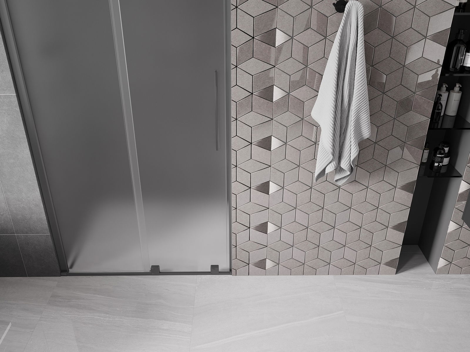 Poignée pratique et confortable en acier inoxydable. La forme moderne associée à une finition assortie à la couleur des profilés confère à l'ensemble un aspect moderne et élégant, soulignant l'esthétique de chaque salle de bain.