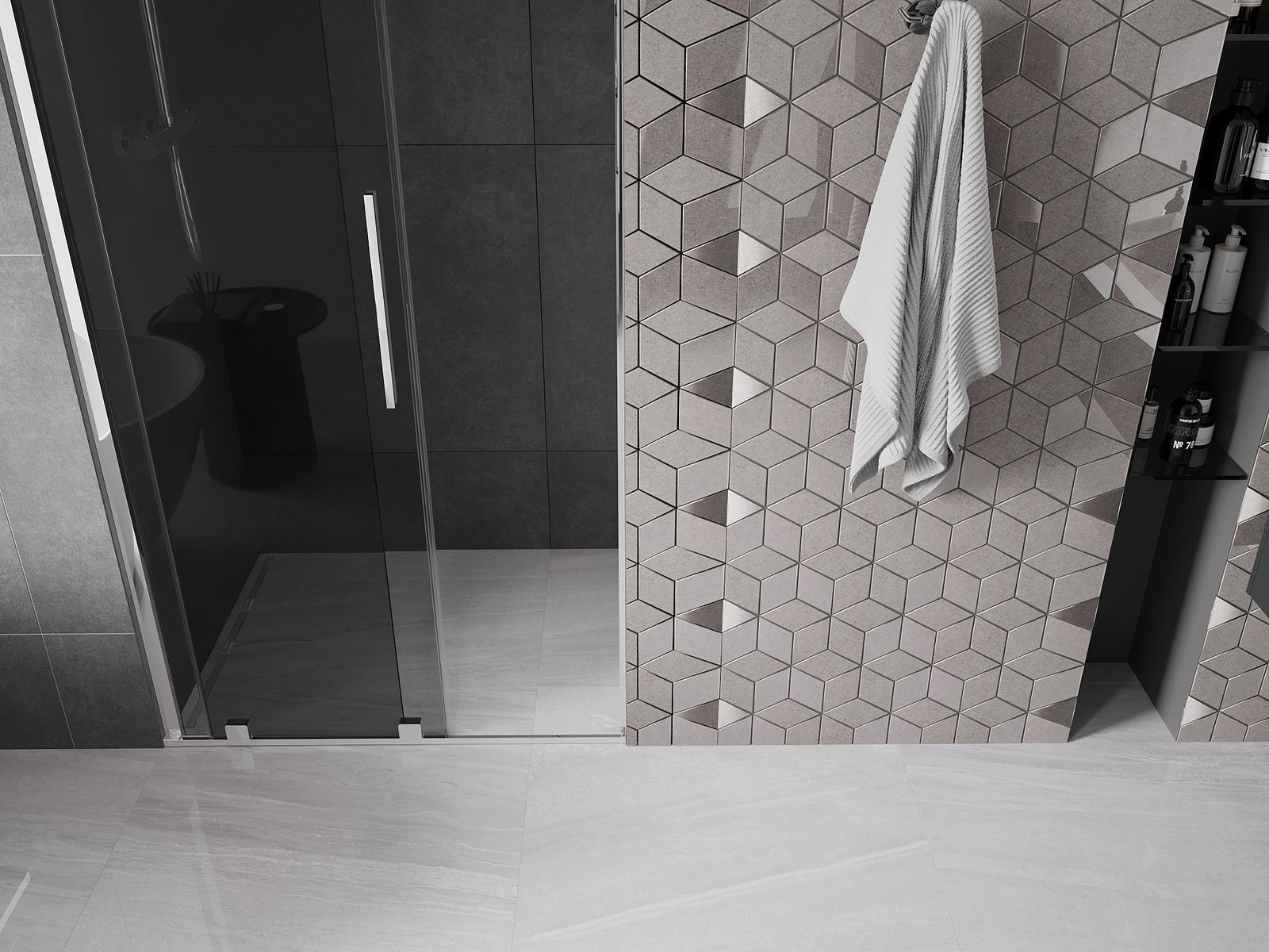 Poignée pratique et confortable en acier inoxydable. La forme moderne associée à une finition assortie à la couleur des profilés confère à l'ensemble un aspect moderne et élégant, soulignant l'esthétique de chaque salle de bain.