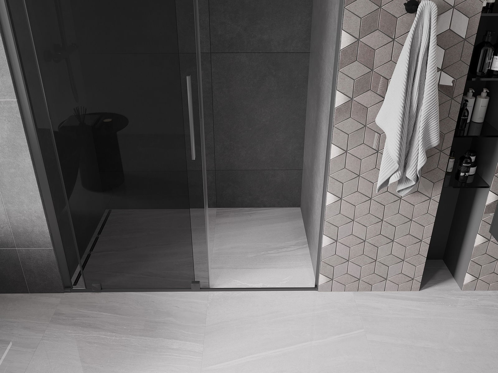Poignée pratique et confortable en acier inoxydable. La forme moderne associée à une finition assortie à la couleur des profilés confère à l'ensemble un aspect moderne et élégant, soulignant l'esthétique de chaque salle de bain.