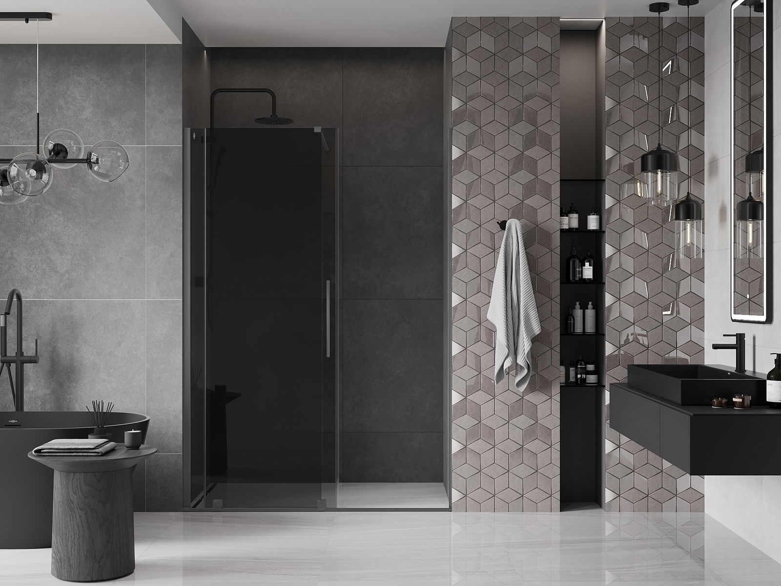 Poignée pratique et confortable en acier inoxydable. La forme moderne associée à une finition assortie à la couleur des profilés confère à l'ensemble un aspect moderne et élégant, soulignant l'esthétique de chaque salle de bain.