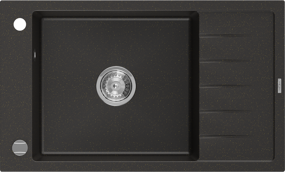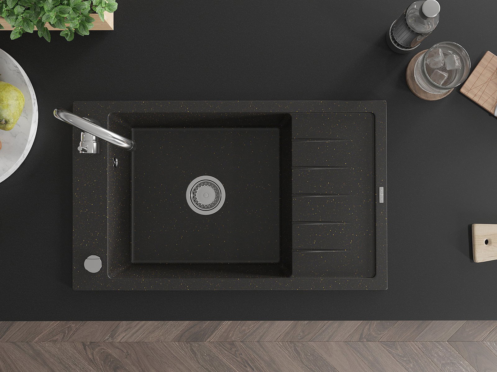 Mexen Elias évier en granit 1 bac avec égouttoir 795 x 480 mm, noir/doré métallique, siphon chromé - 6511791005-75