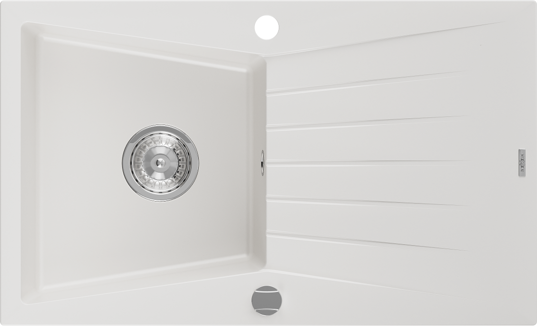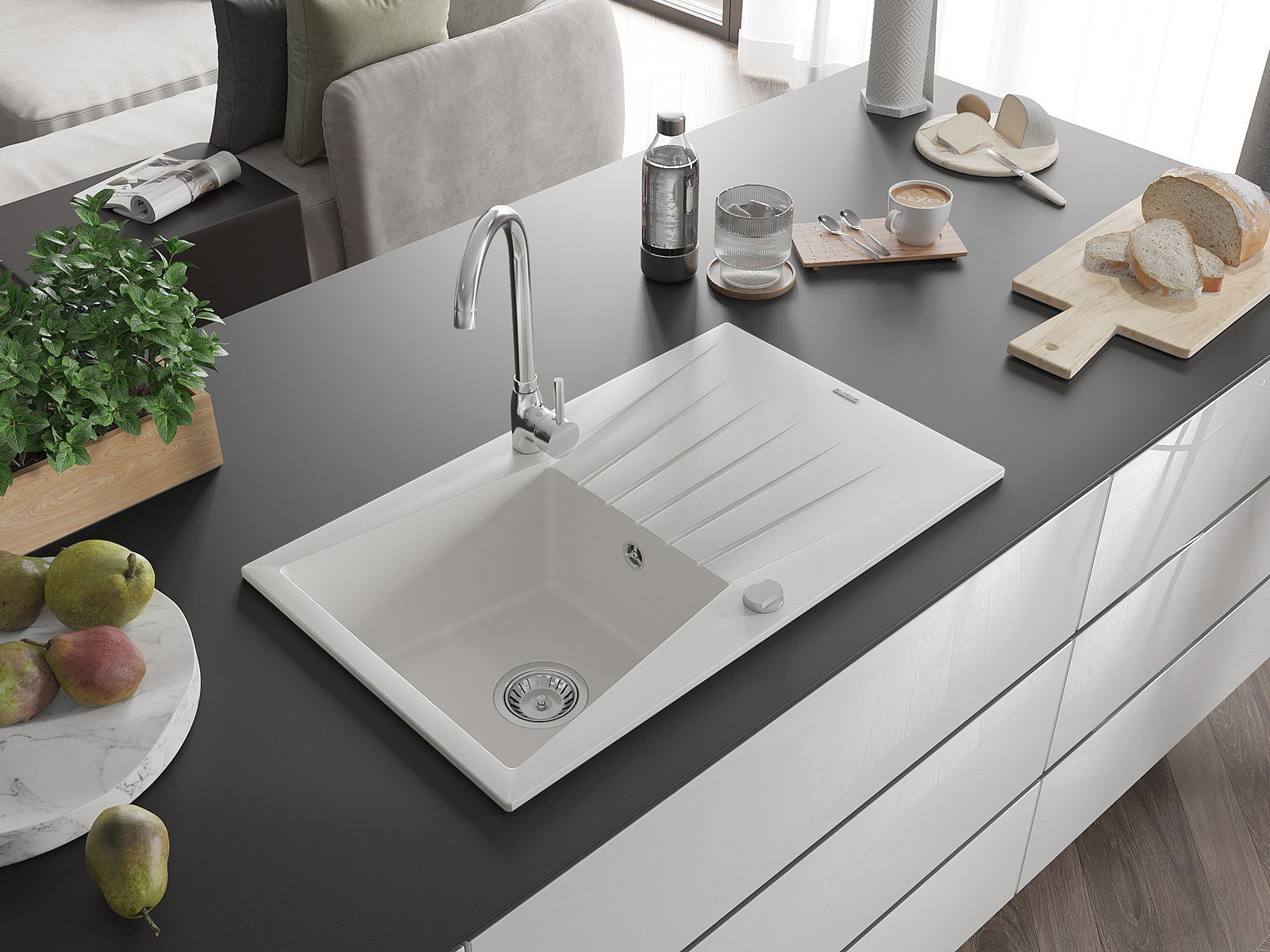Mexen Cesar évier en granit 1 bac avec égouttoir 775 x 470 mm, blanc, siphon chromé - 6514771010-20