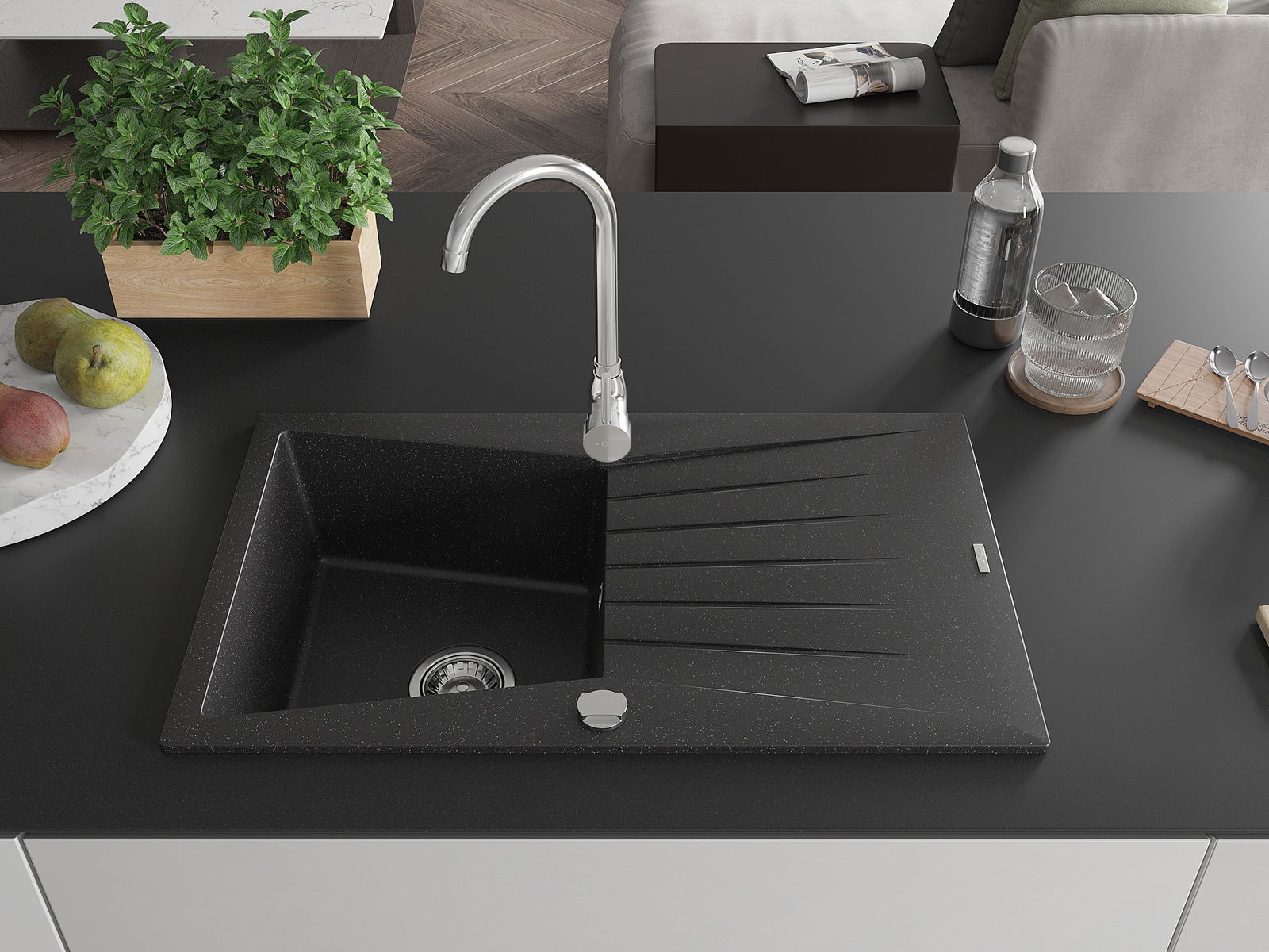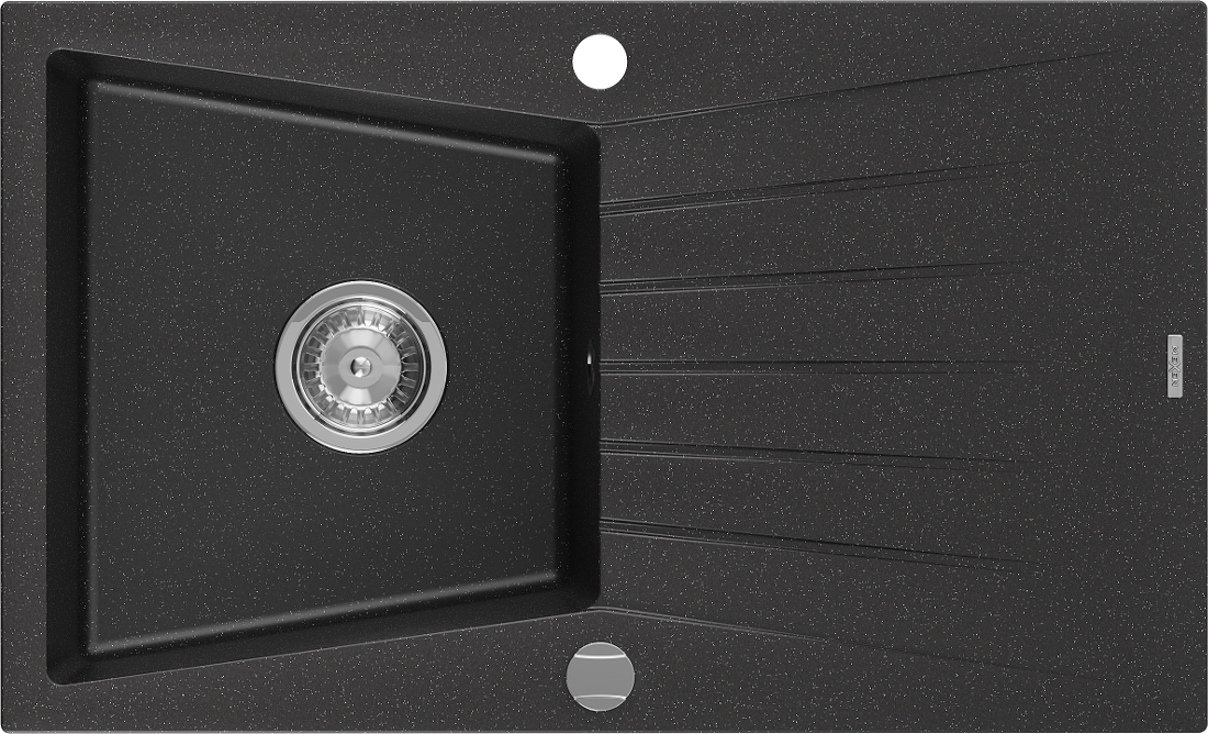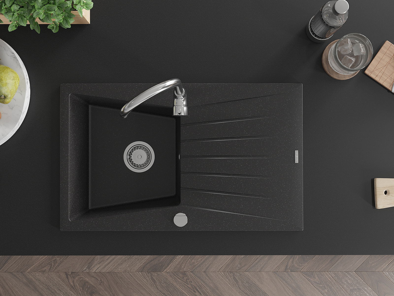Mexen Cesar évier en granit 1 bac avec égouttoir 775 x 470 mm, noir/argent métallisé, siphon chromé - 6514771010-73