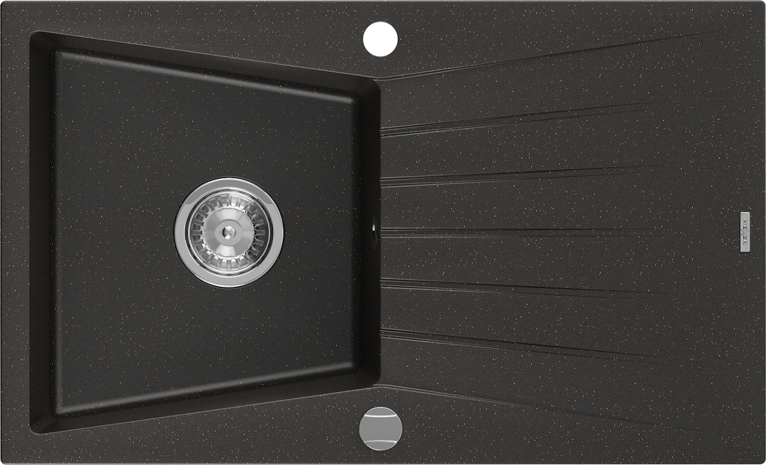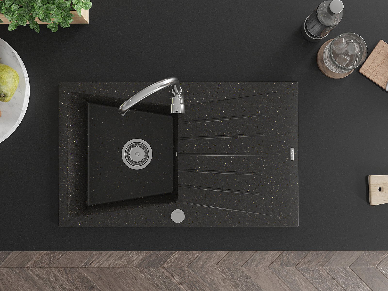 Mexen César évier en granit 1 bac avec égouttoir 775 x 470 mm, noir/or métallisé, siphon chromé - 6514771010-75
