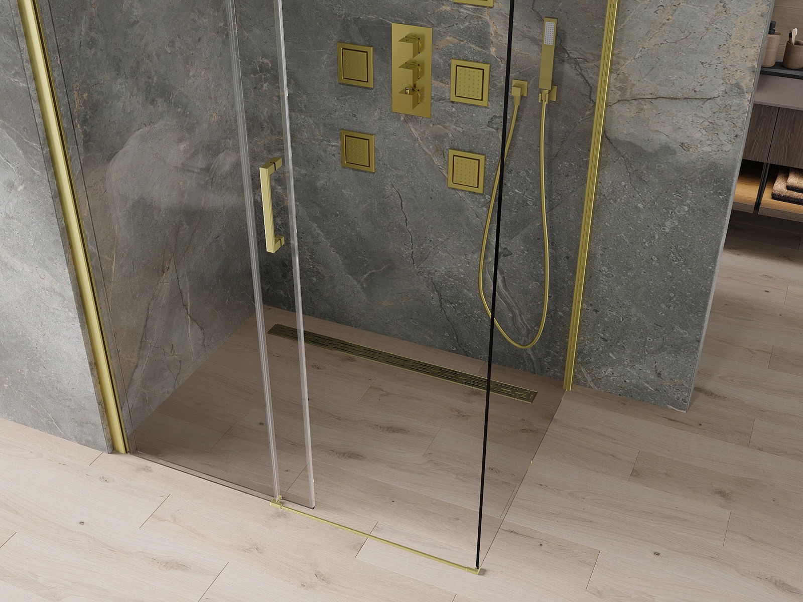 La poignée pratique et confortable est fabriquée en métal durable et résistant. Sa forme élégante, associée à une finition assortie à la couleur des profilés, confère à l'ensemble un style moderne et élégant, soulignant l'esthétique de chaque salle de bains.
