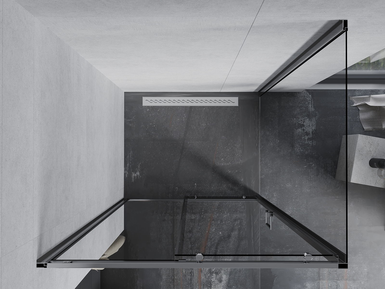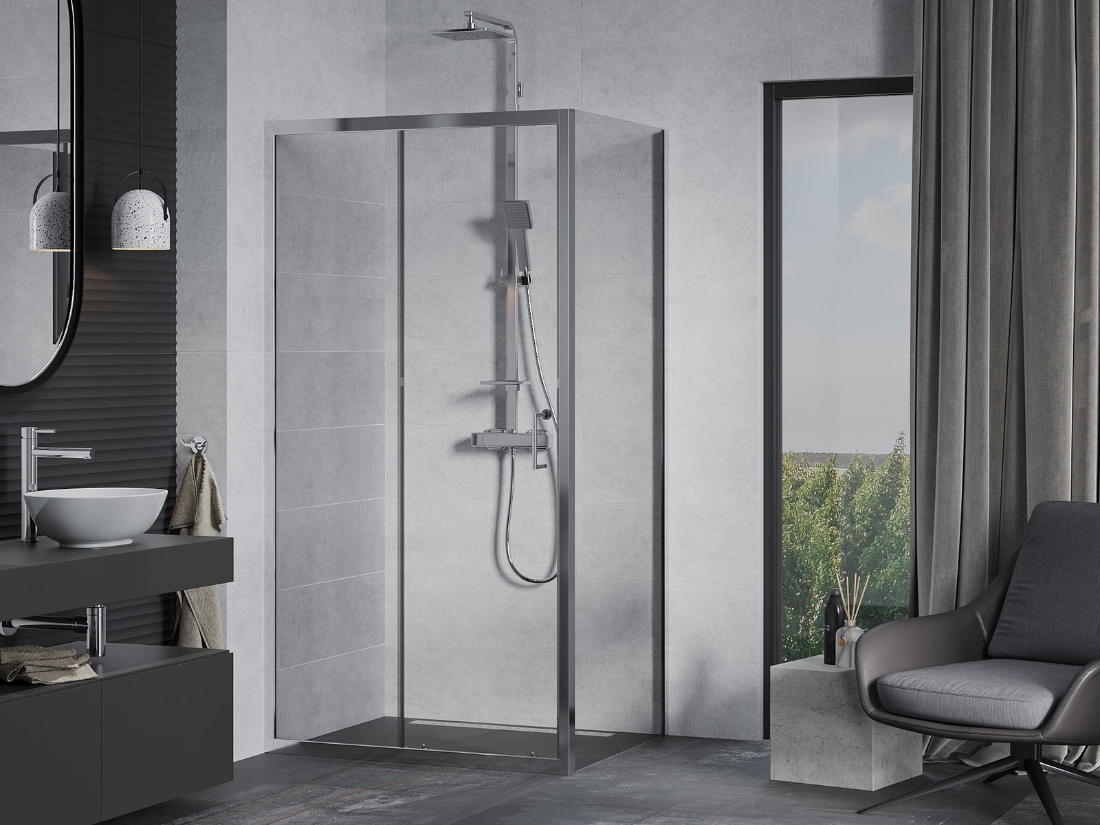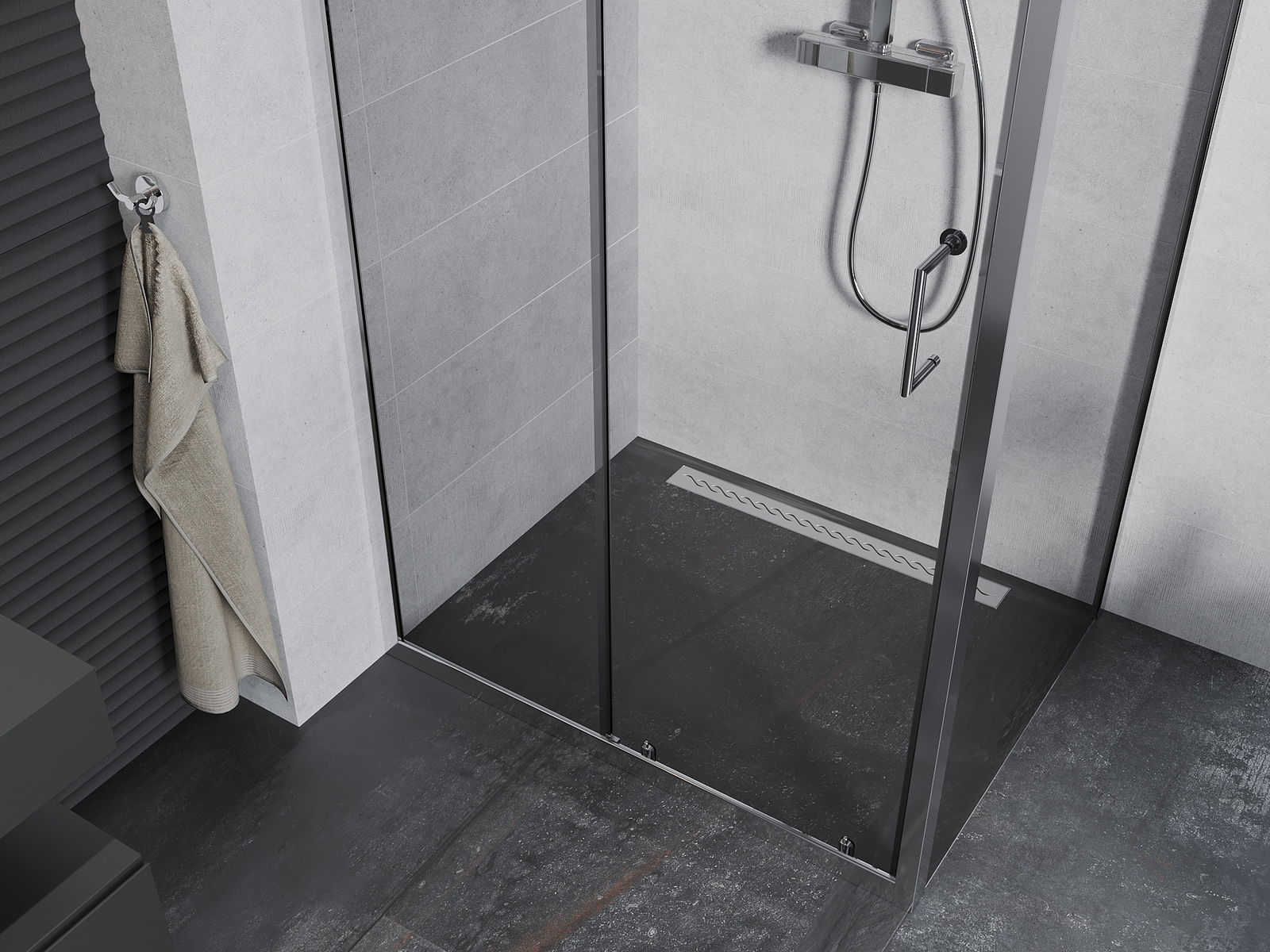 La poignée pratique et confortable est fabriquée en métal durable et résistant. Sa forme à la mode, combinée à une finition assortie à la couleur des profilés, donne à l'ensemble un aspect moderne et stylé, soulignant l'esthétique de chaque salle de bain.