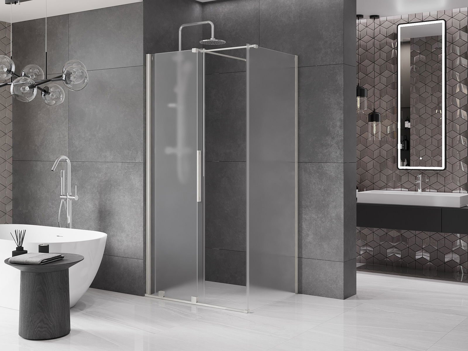 Poignée pratique et confortable en acier inoxydable. La forme moderne associée à une finition assortie à la couleur des profilés confère à l'ensemble un aspect moderne et élégant, soulignant l'esthétique de chaque salle de bain.