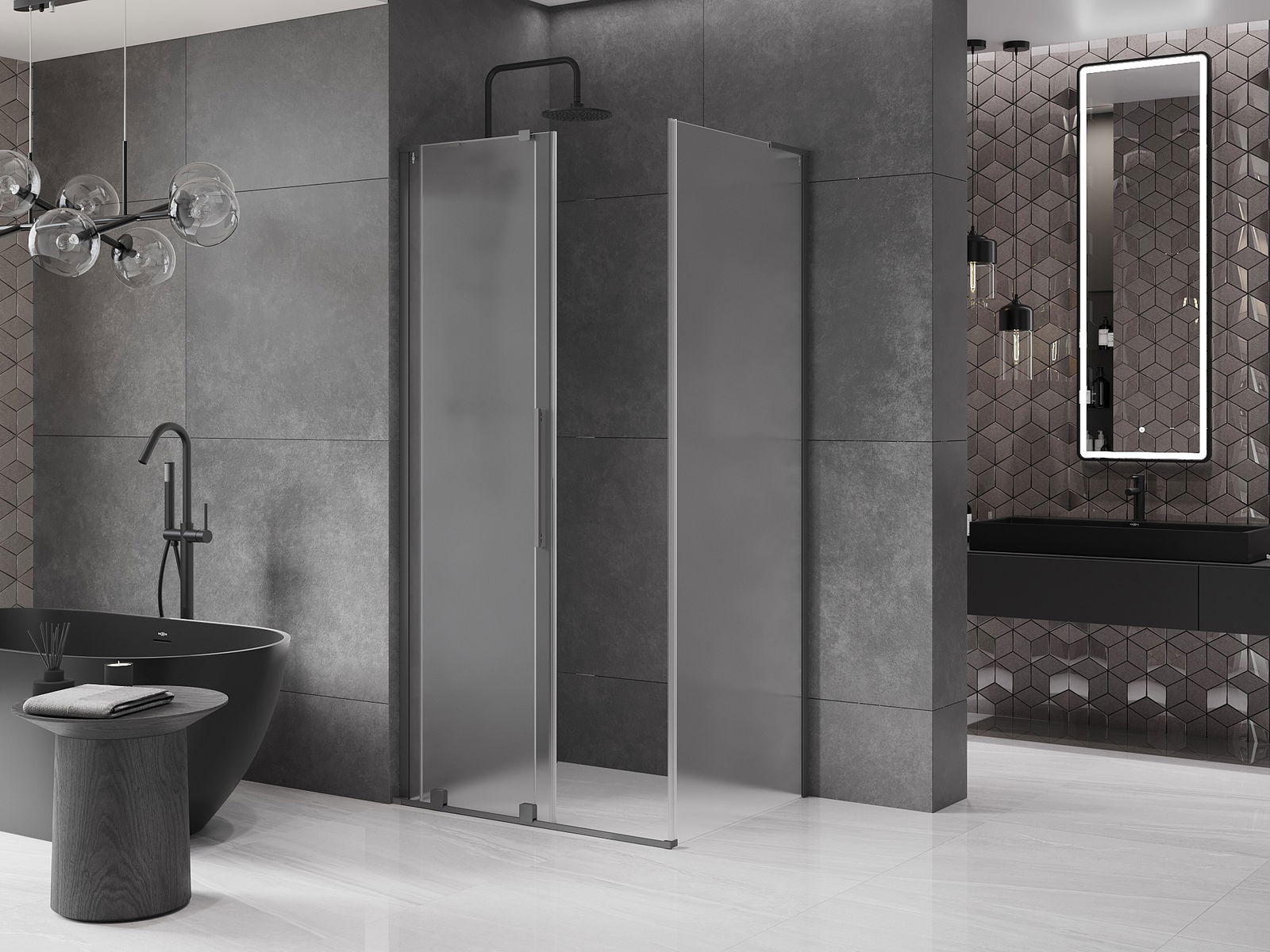 Poignée pratique et confortable en acier inoxydable. La forme moderne associée à une finition assortie à la couleur des profilés confère à l'ensemble un aspect moderne et élégant, soulignant l'esthétique de chaque salle de bain.