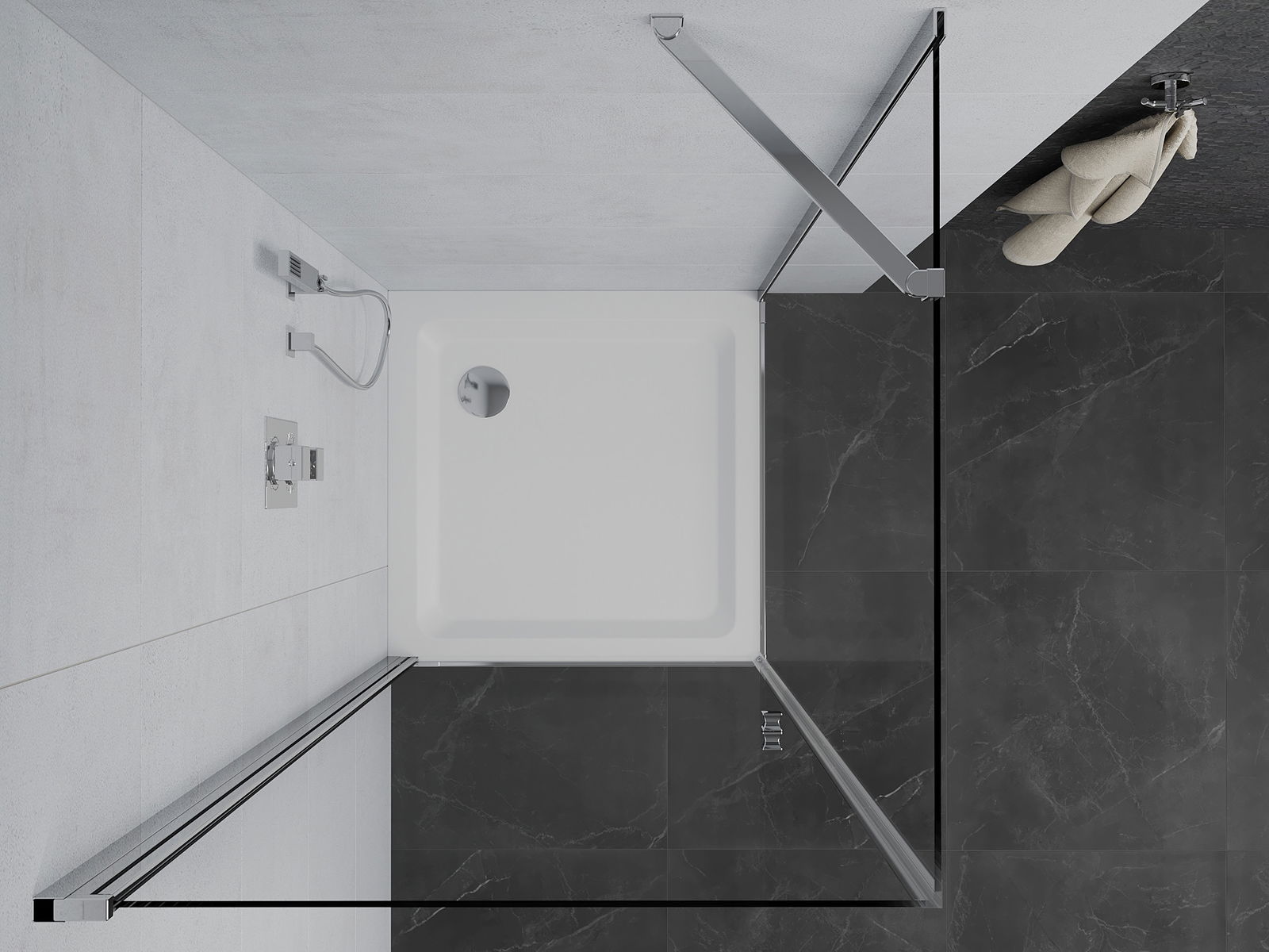 La poignée pratique et confortable est fabriquée en métal durable et résistant. Sa forme élégante, associée à une finition assortie à la couleur des profilés, confère à l'ensemble un style moderne et élégant, soulignant l'esthétique de chaque salle de bains.