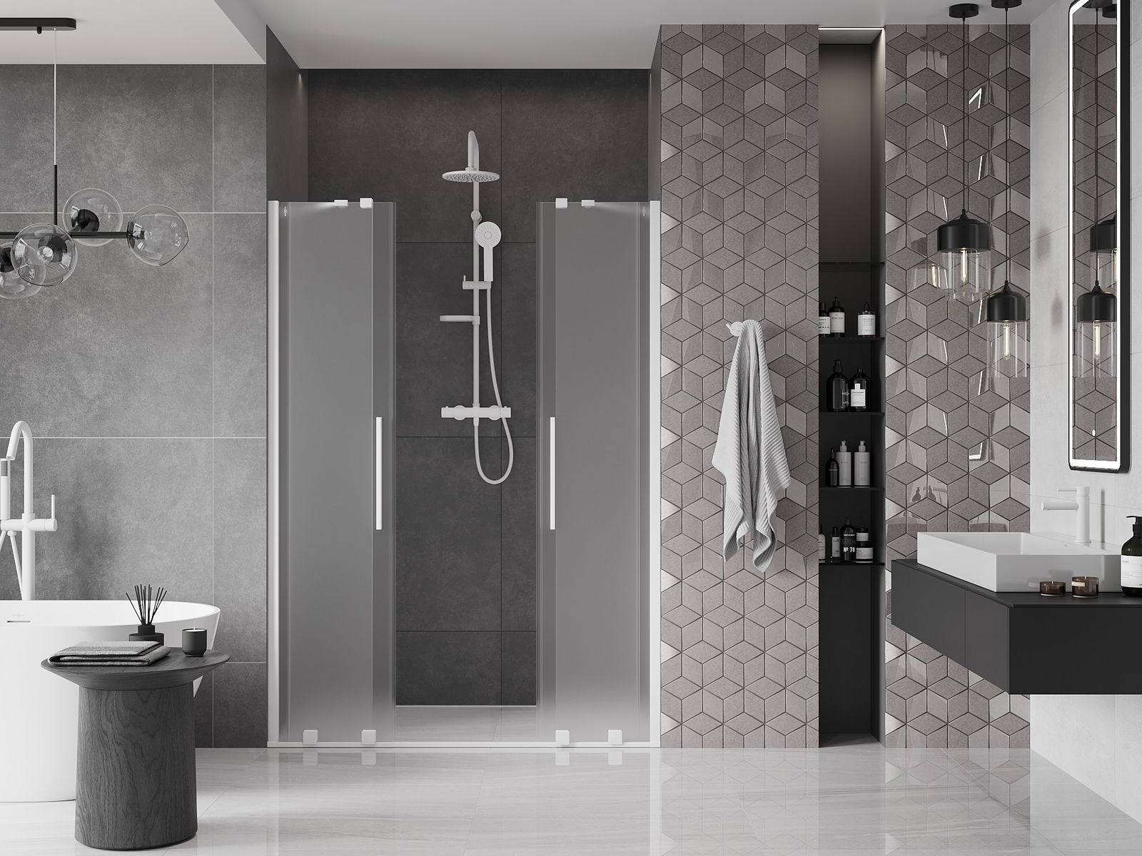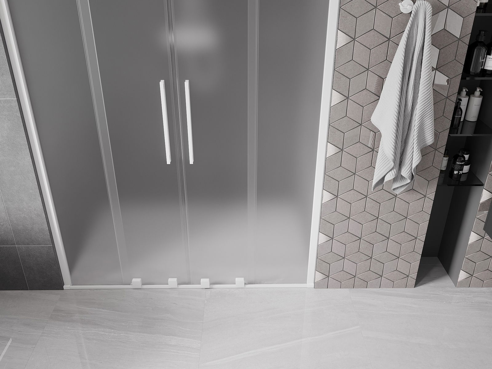 Poignée pratique et confortable en acier inoxydable. La forme moderne associée à une finition assortie à la couleur des profilés confère à l'ensemble un aspect moderne et élégant, soulignant l'esthétique de chaque salle de bain.
