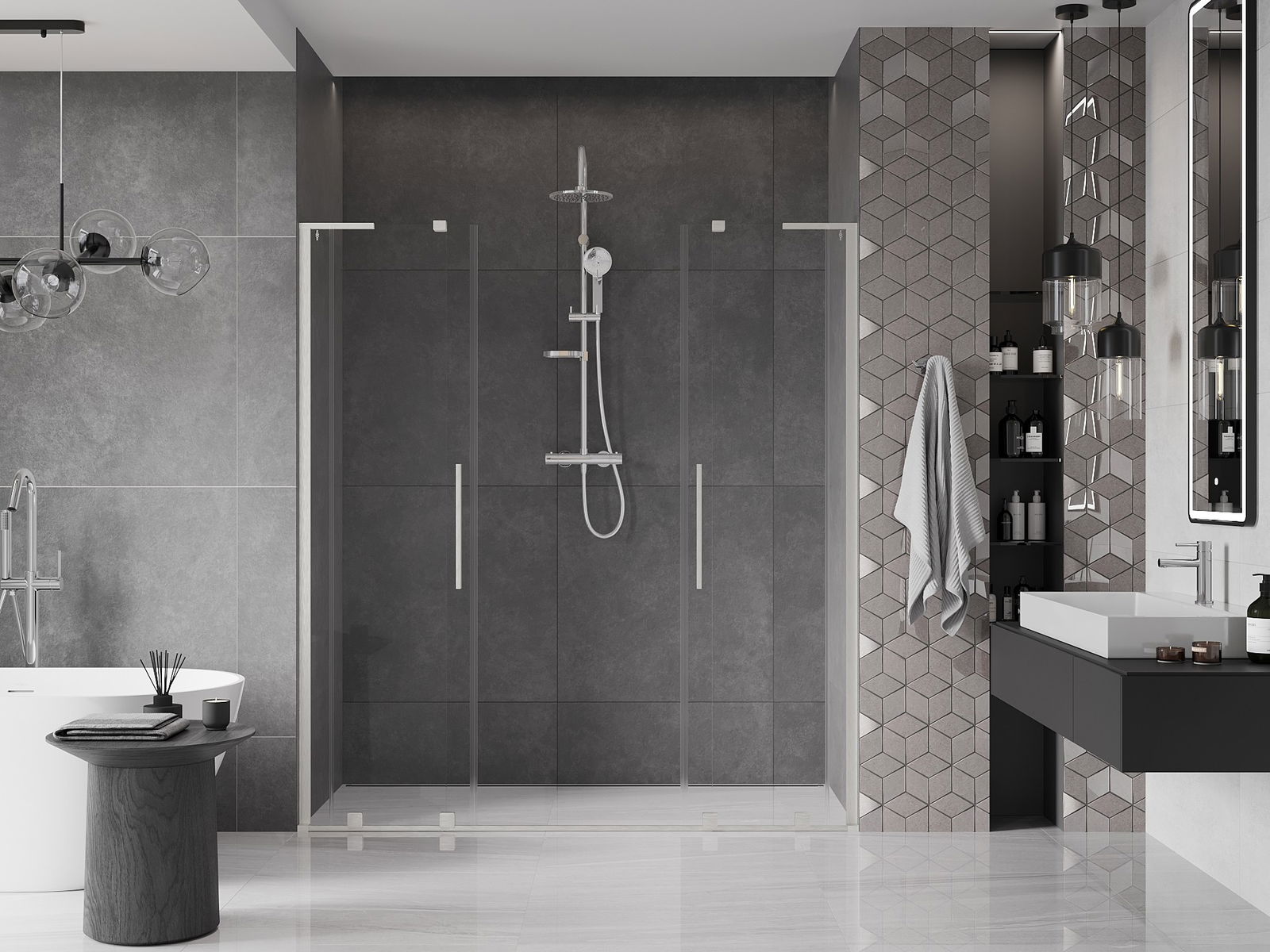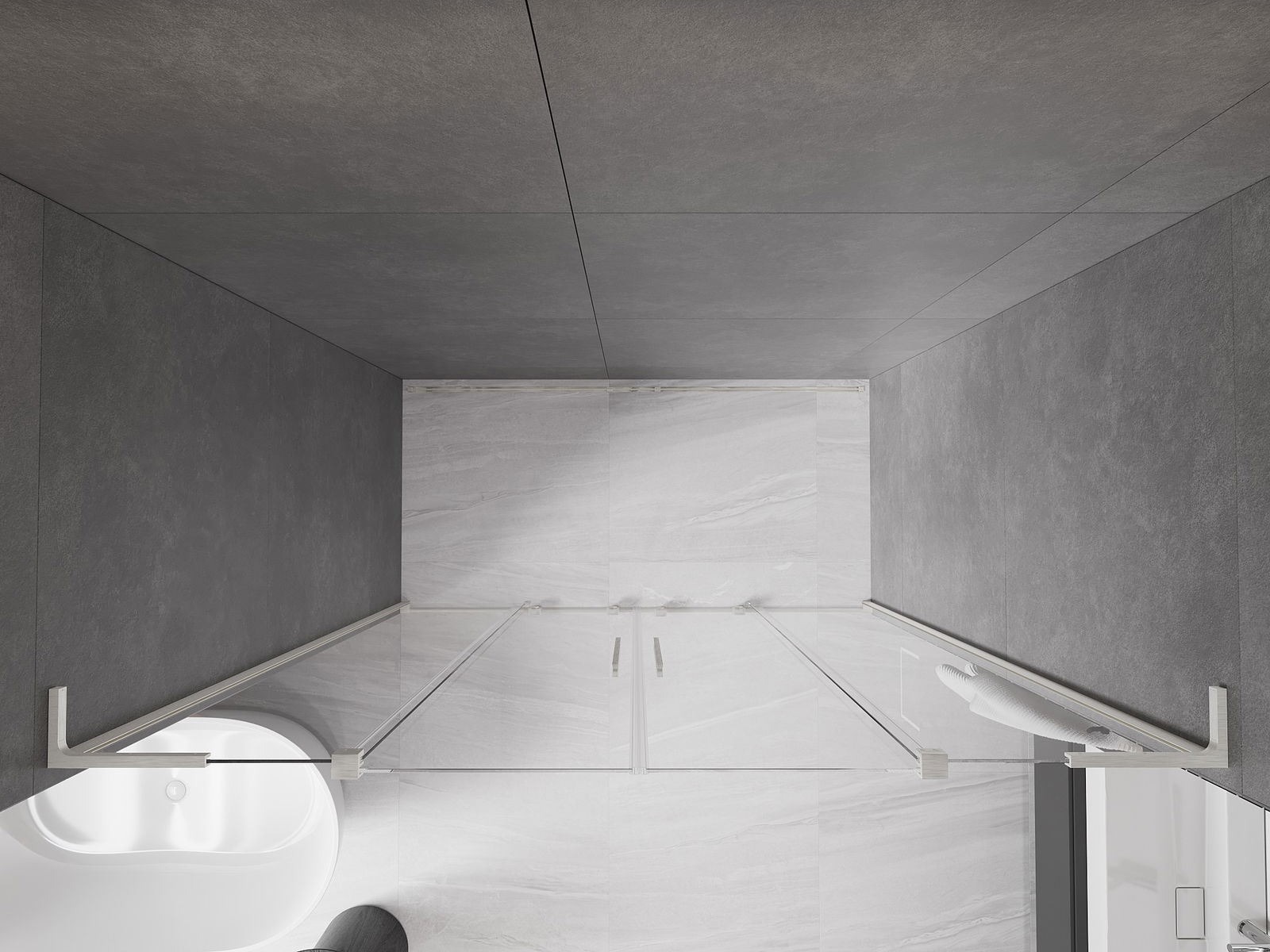 Poignée pratique et confortable en acier inoxydable. La forme moderne associée à une finition assortie à la couleur des profilés confère à l'ensemble un aspect moderne et élégant, soulignant l'esthétique de chaque salle de bain.