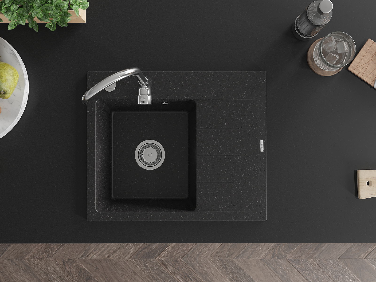 Mexen Ben évier en granit 1 bac avec égouttoir, gauche 600 x 500 mm, noir/argent métallisé, siphon chrome - 6522605000-73