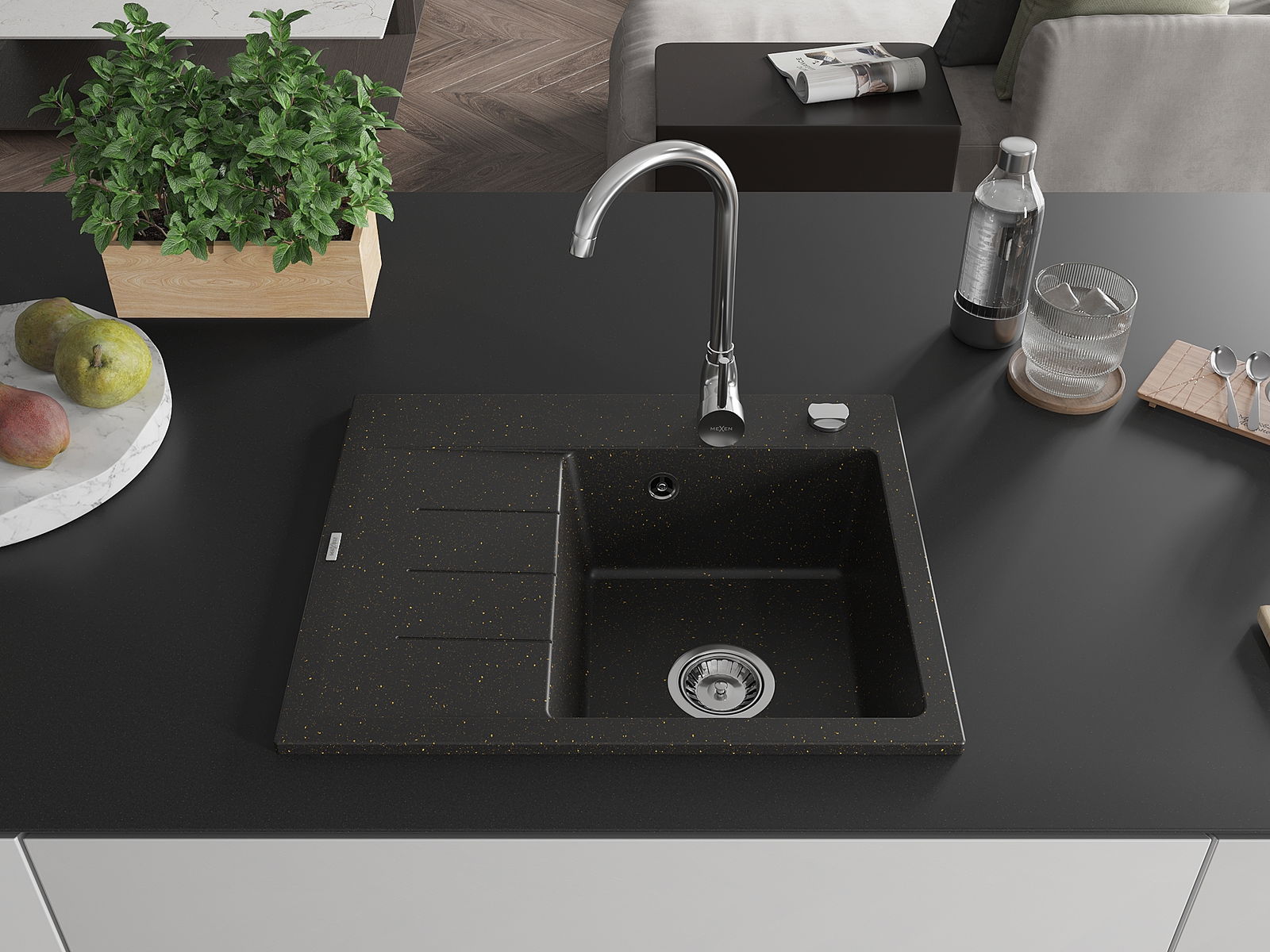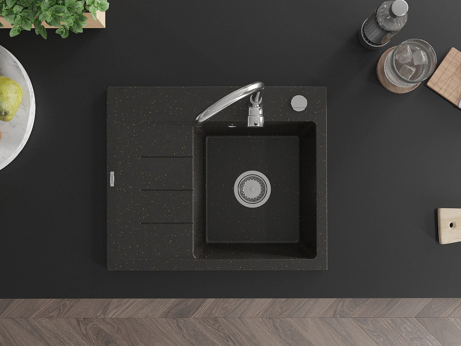 Mexen Ben évier en granit 1 bac avec égouttoir, droit 600 x 500 mm, noir/doré métallisé, siphon chromé - 6523605000-75