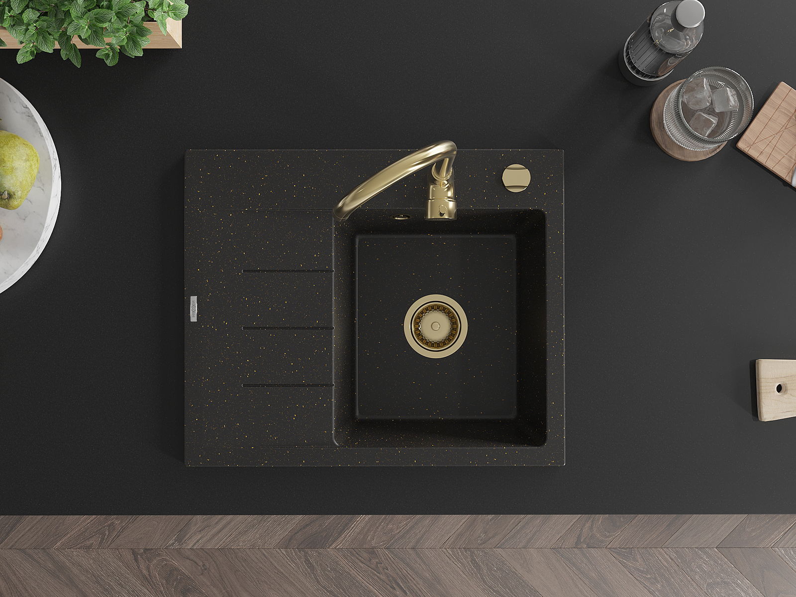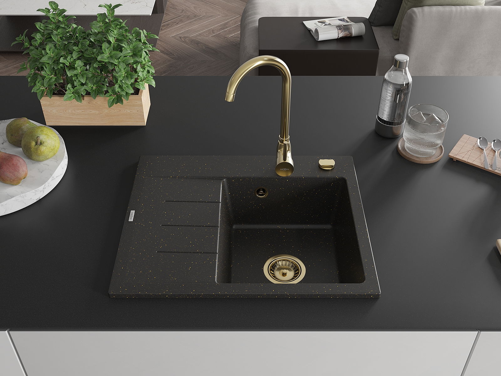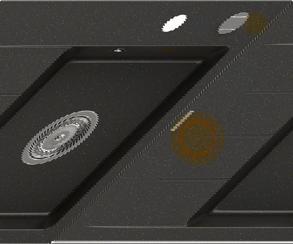 Mexen Ben évier en granit 1 bac avec égouttoir, droit 600 x 500 mm, noir/doré métallique, siphon doré - 6523605000-75-G