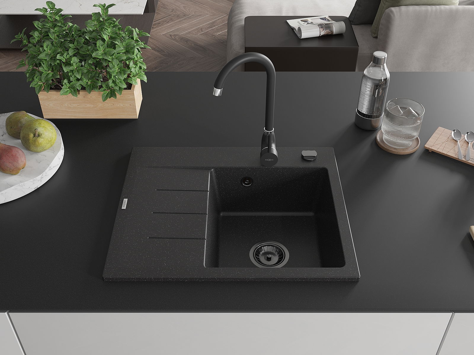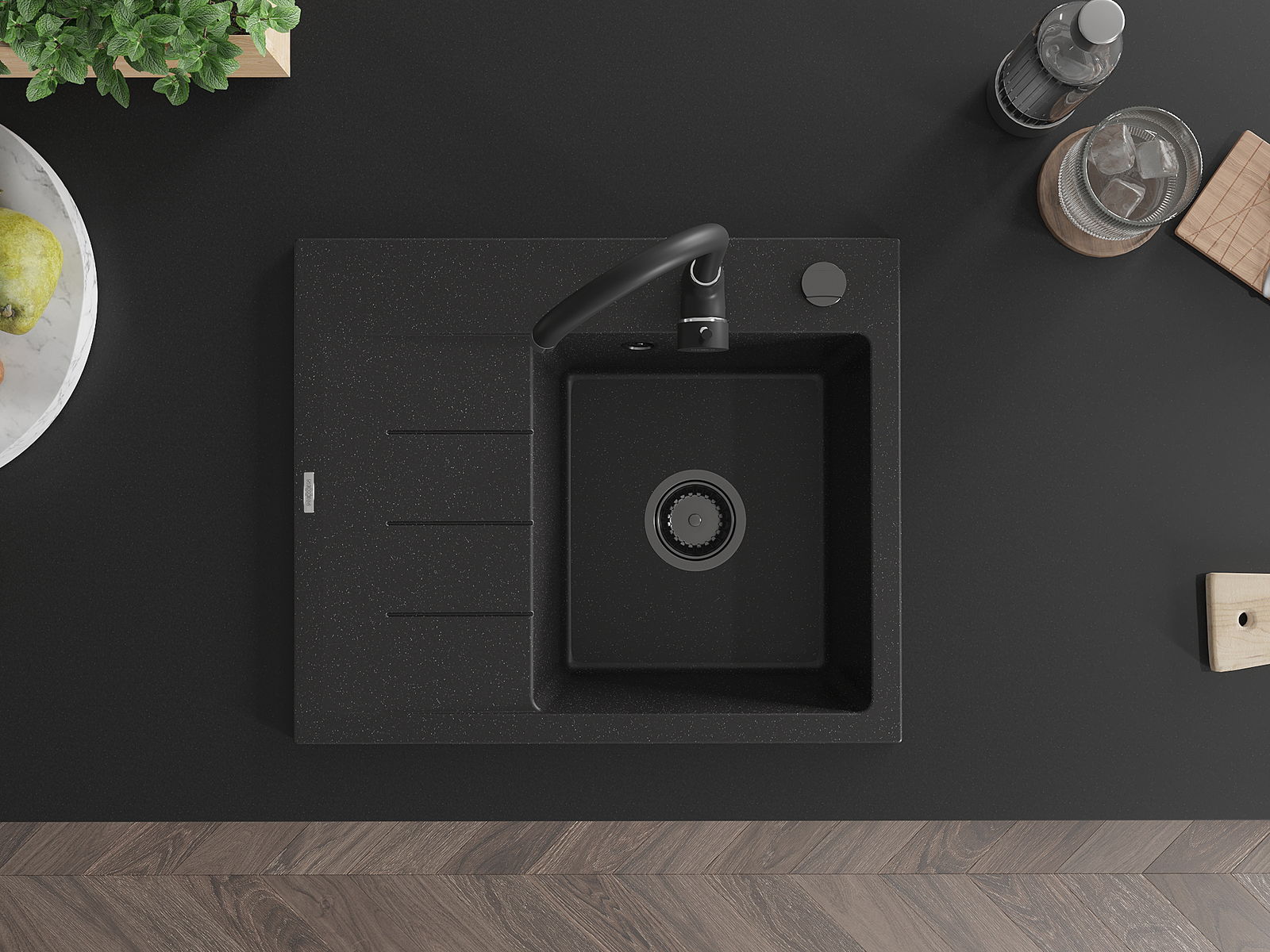 Mexen Ben évier en granit à 1 bac avec égouttoir, droit 600x500 mm, noir/argent métallisé siphon noir - 6523605000-73-B