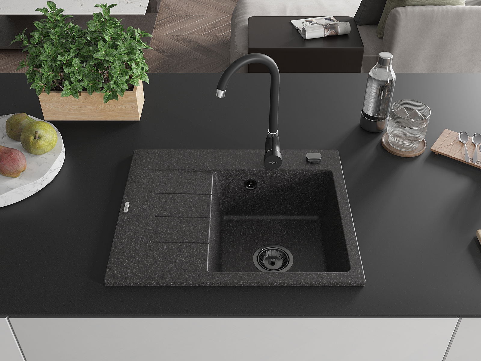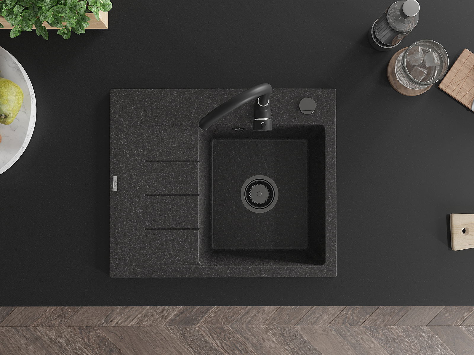 Mexen Ben évier en granit 1 bac avec égouttoir, à droite 600 x 500 mm, noir moucheté, siphon noir - 6523605000-76-B