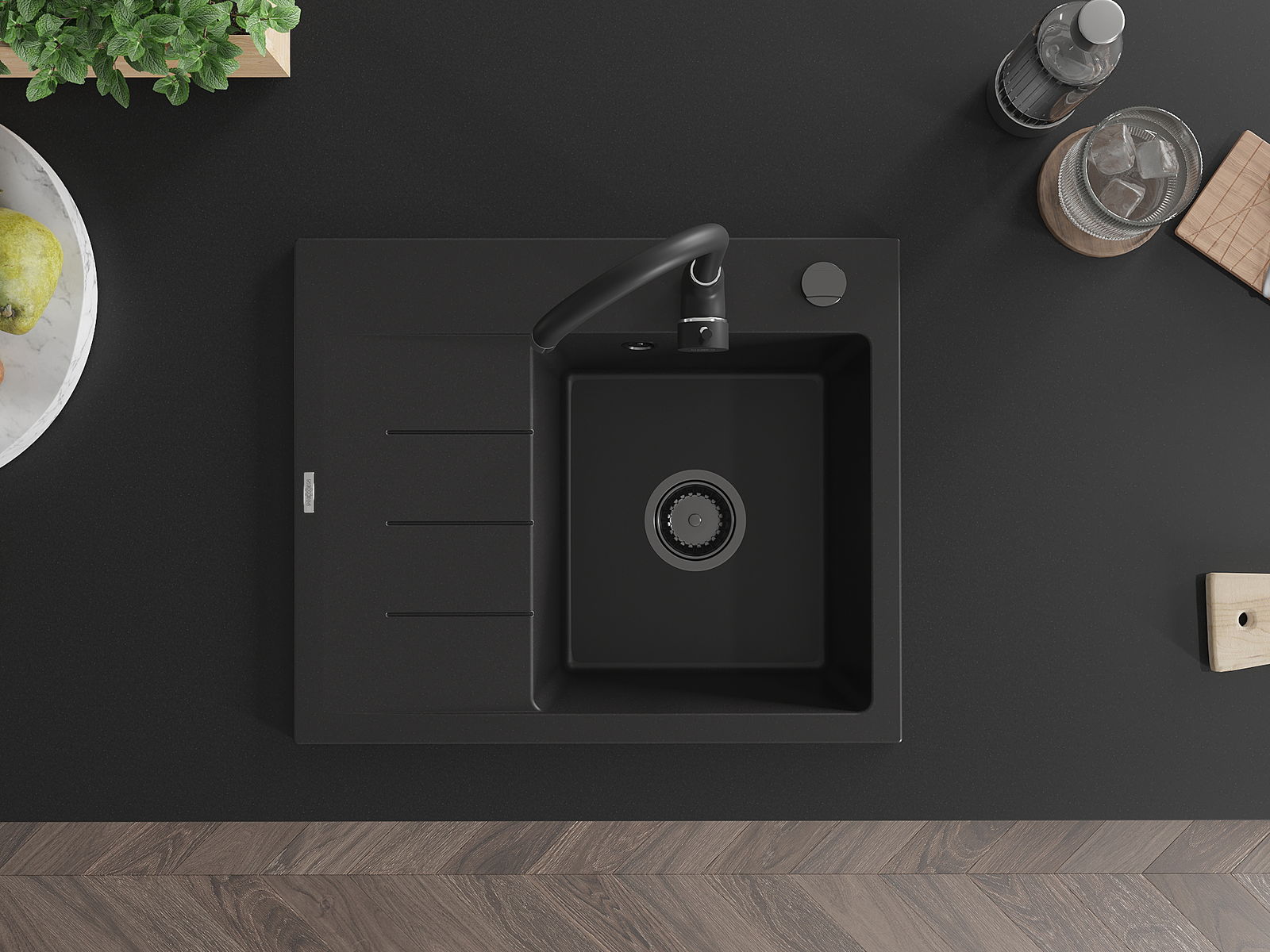 L'évier a un trou sous-meulé de 35 mm de diamètre à percer soi-même. Il peut être utilisé, entre autres, pour installer un distributeur de liquide, ce qui éliminera la présence de bouteilles en plastique dans la cuisine et lui donnera une finition élégante.