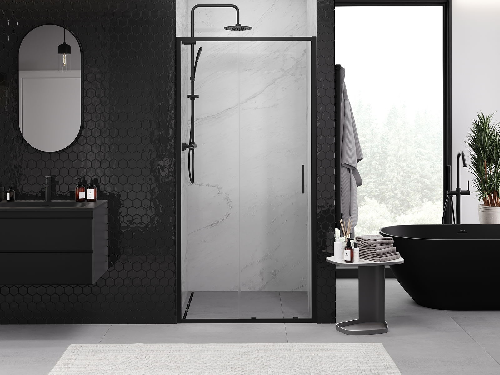 La poignée pratique et confortable est fabriquée en métal durable et résistant. Sa forme à la mode, combinée à une finition assortie à la couleur des profilés, donne à l'ensemble un aspect moderne et stylé, soulignant l'esthétique de chaque salle de bain.