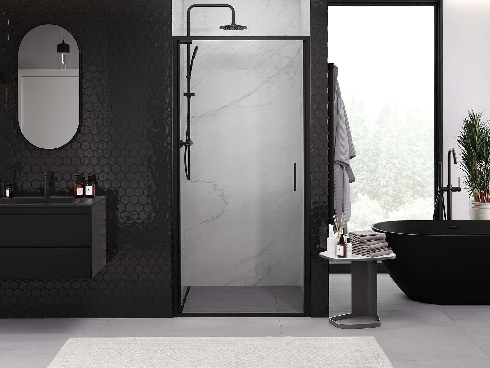 La poignée pratique et confortable est fabriquée en métal durable et résistant. Sa forme à la mode, combinée à une finition assortie à la couleur des profilés, donne à l'ensemble un aspect moderne et stylé, soulignant l'esthétique de chaque salle de bain.