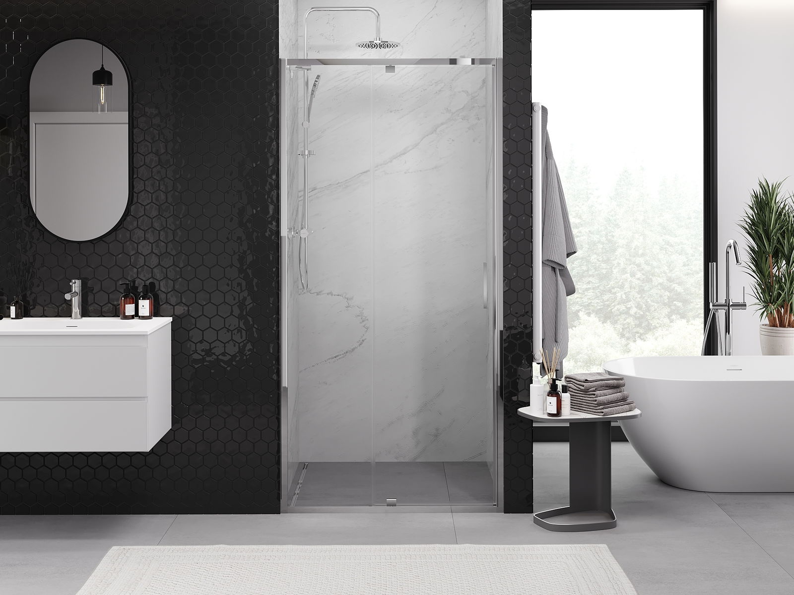 La poignée pratique et confortable est fabriquée en métal durable et résistant. Sa forme à la mode, combinée à une finition assortie à la couleur des profilés, donne à l'ensemble un aspect moderne et stylé, soulignant l'esthétique de chaque salle de bain.